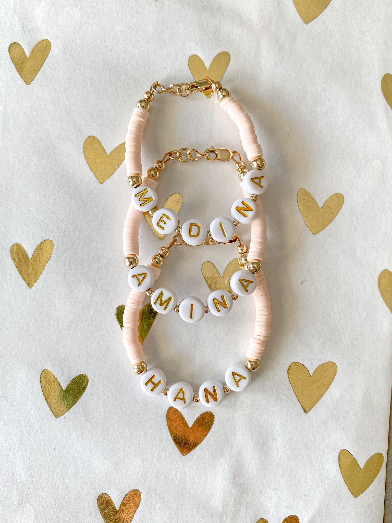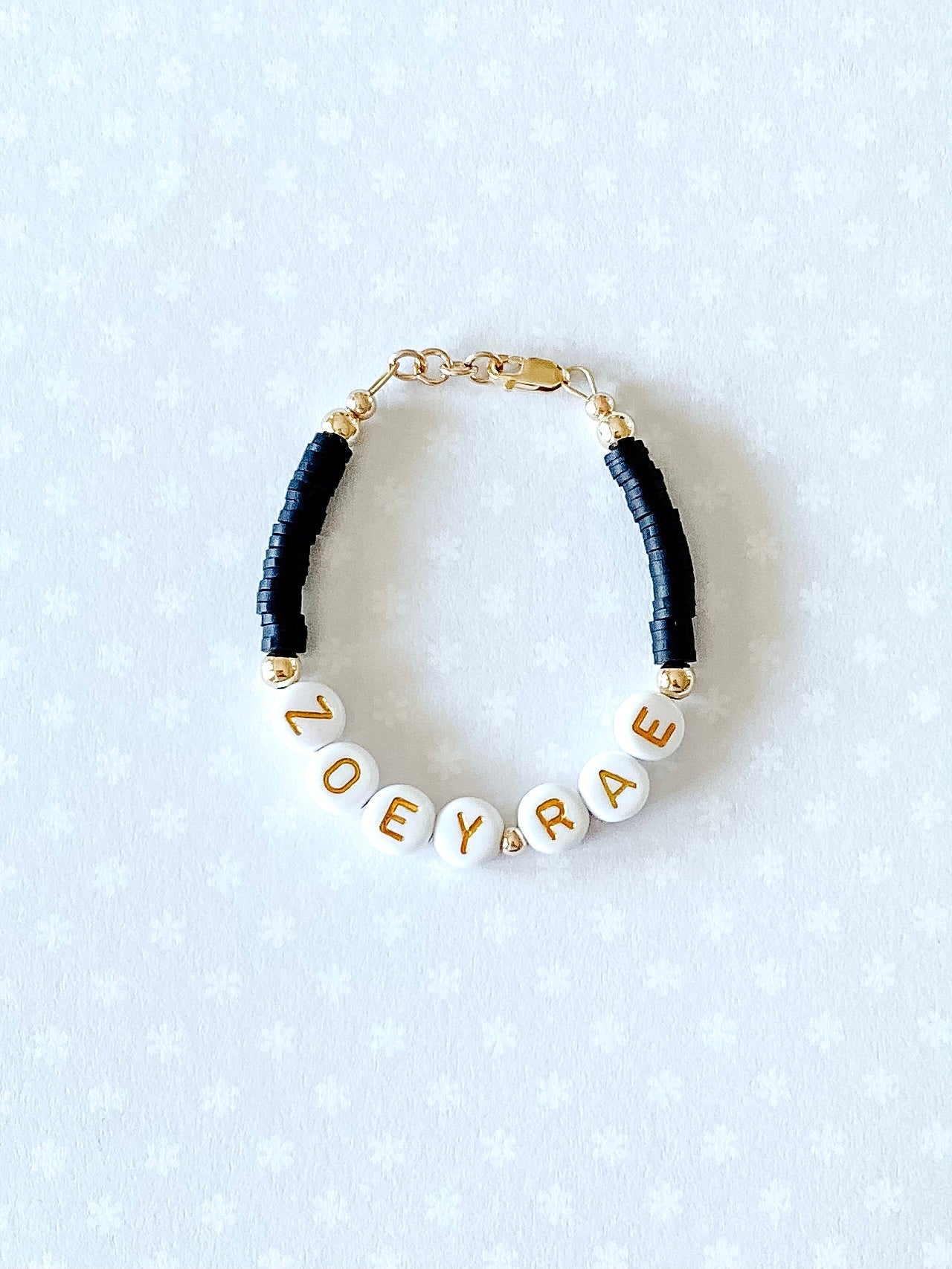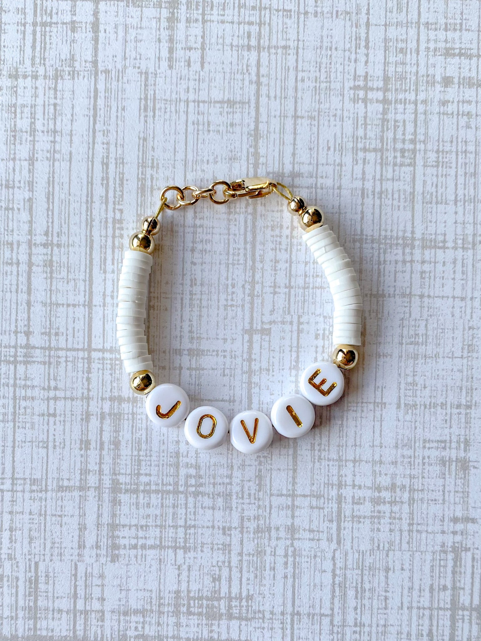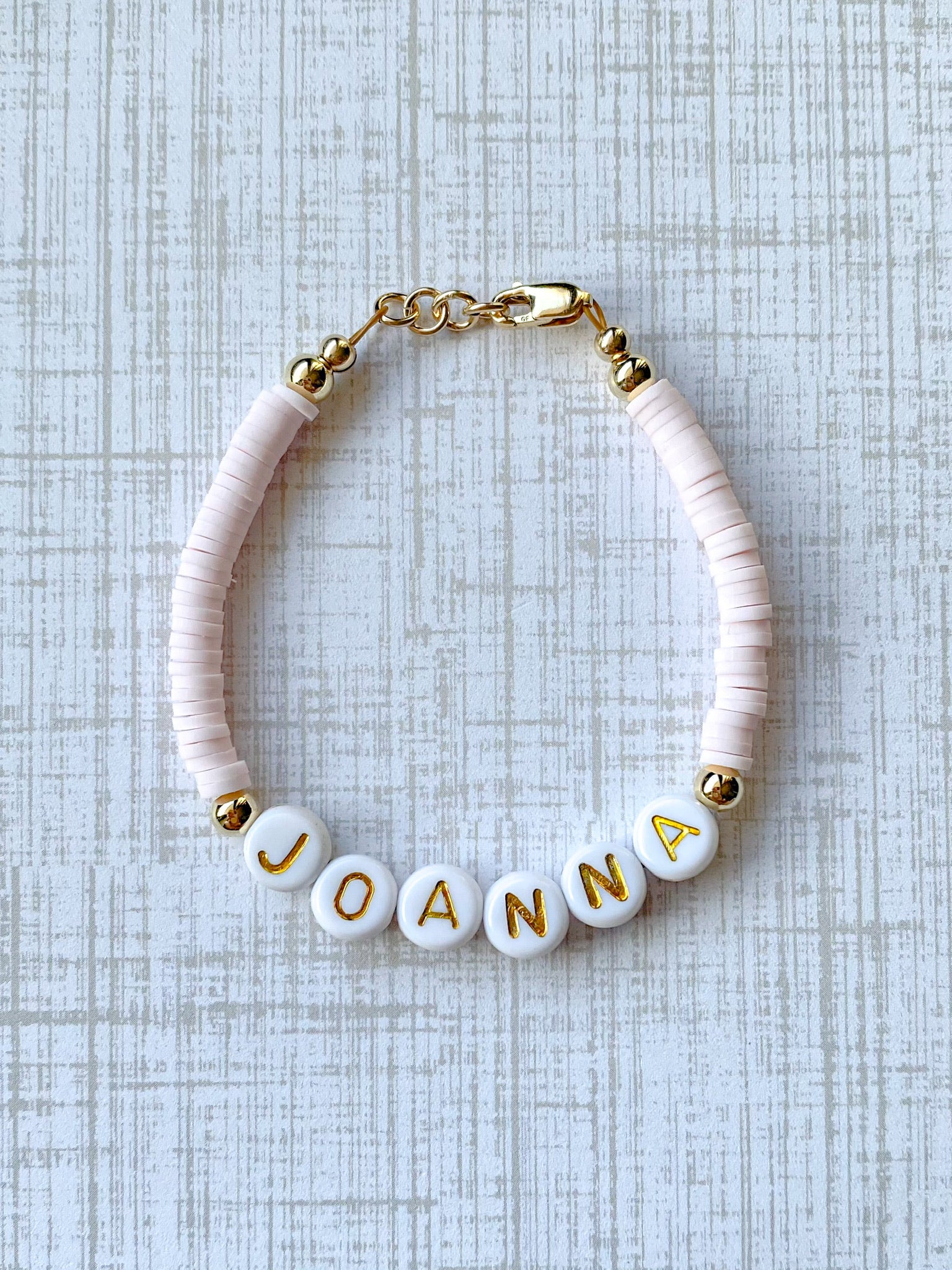 this bracelet is a personalized 3MM vinyl heishi disc bracelet with gold filled beads