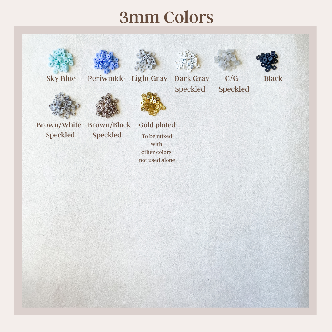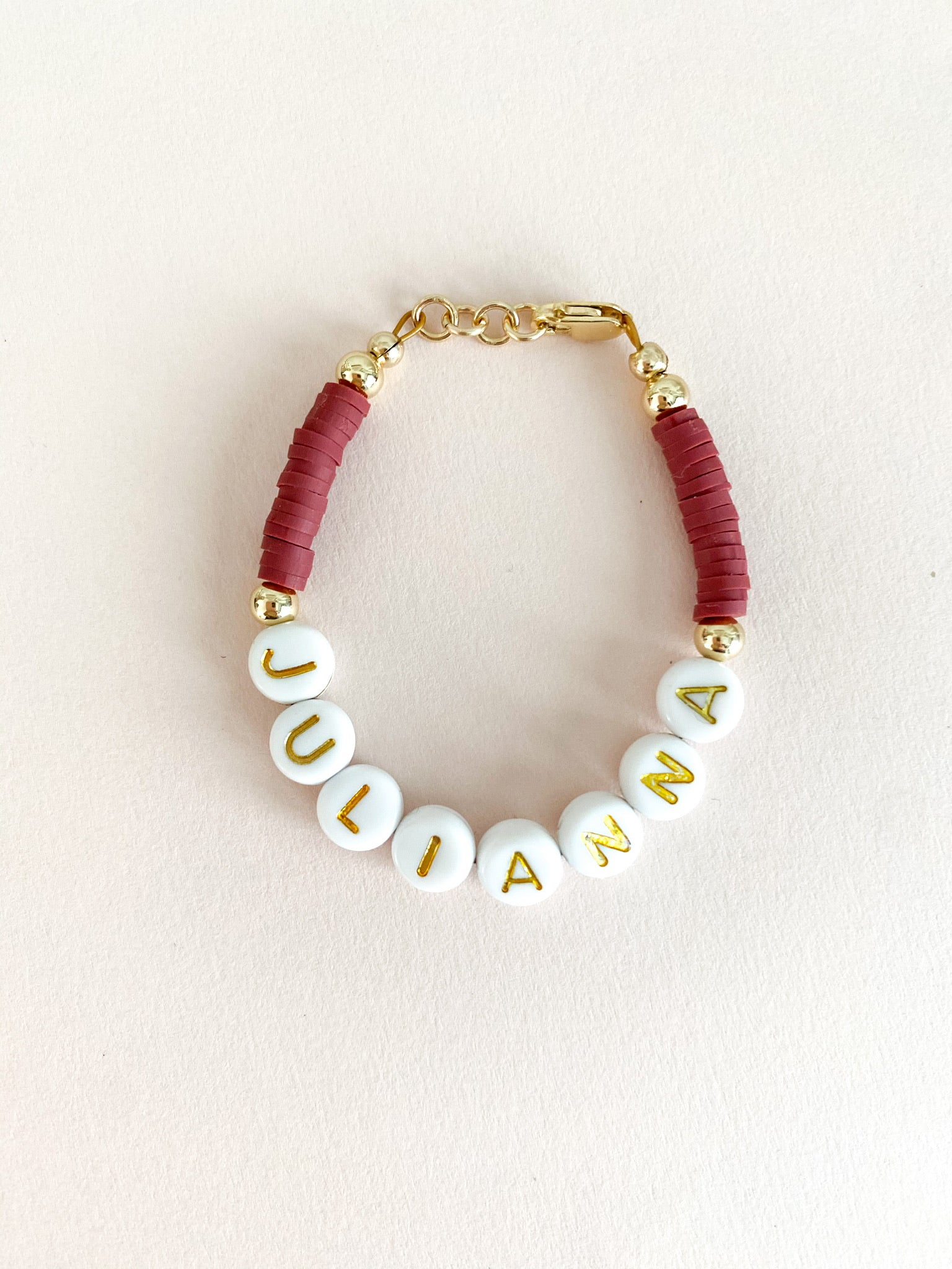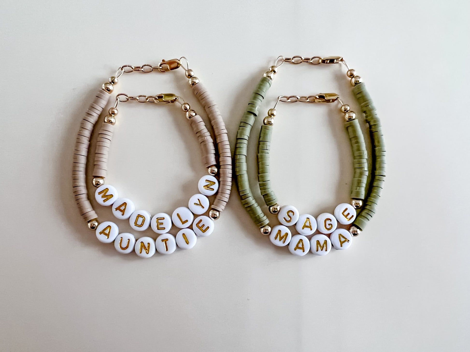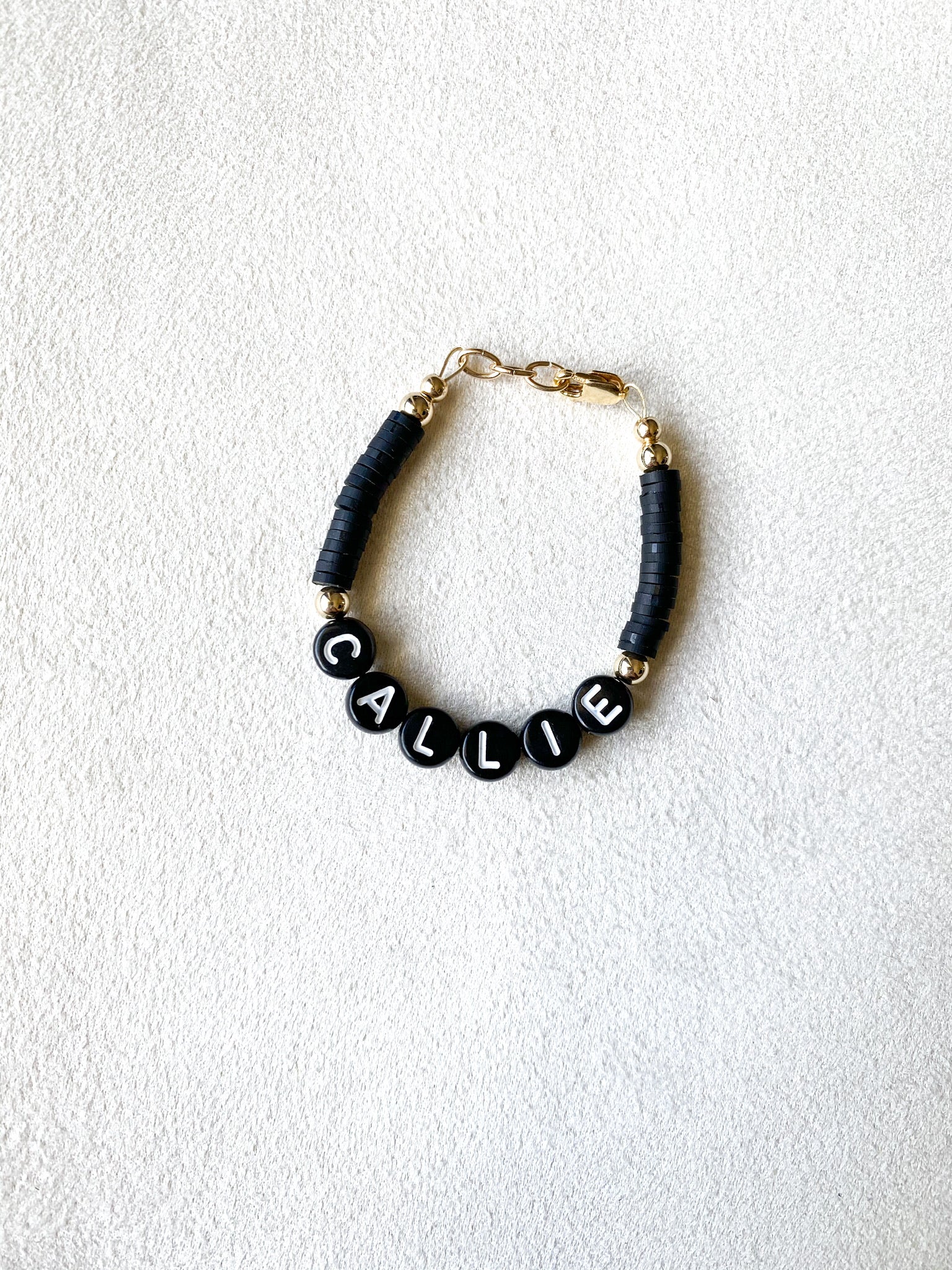 this bracelet is a personalized 3MM vinyl heishi disc bracelet with gold filled beads