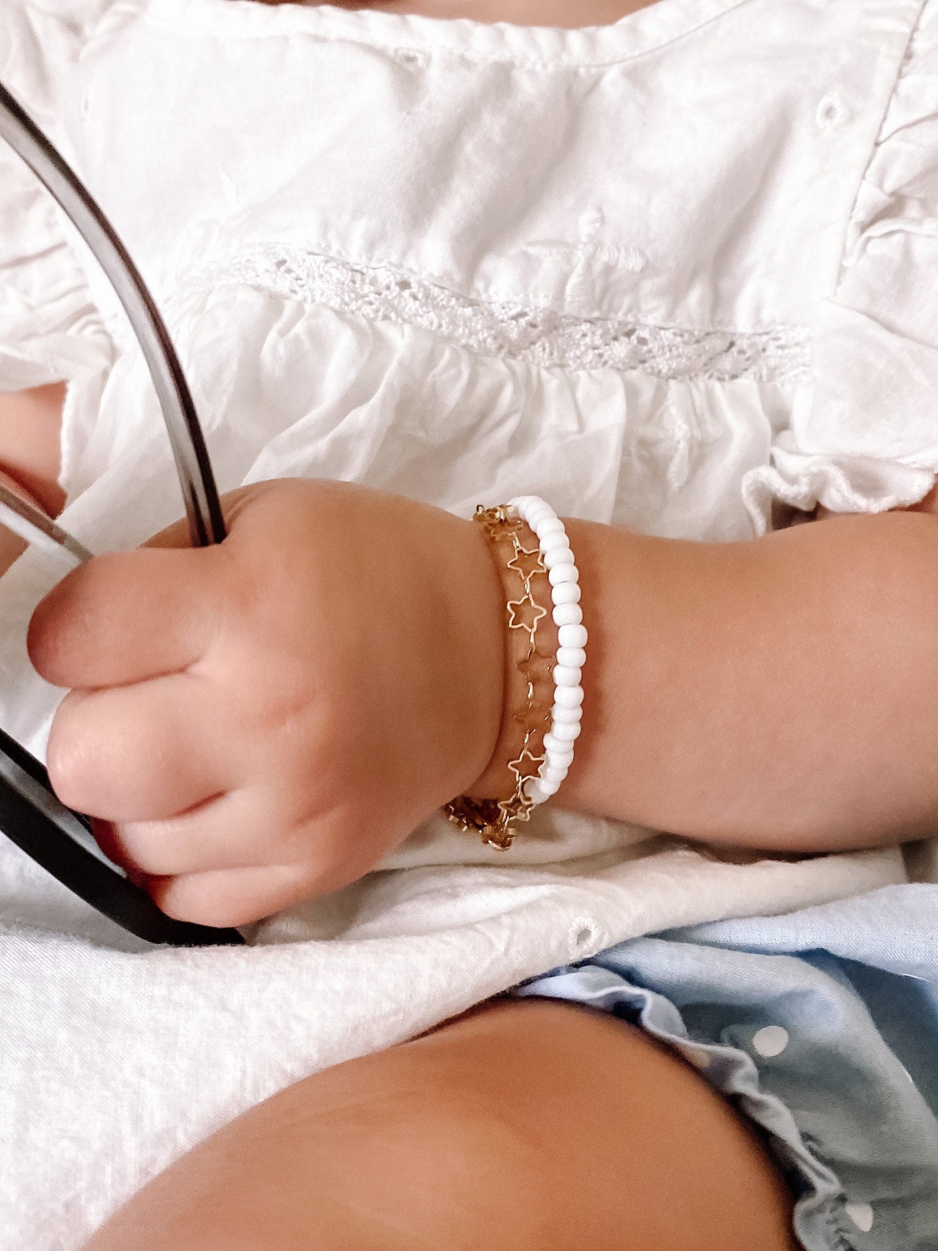 *when purchasing for infants, remember to remove bracelets before naps and keep a close eye on teething babies, as small components can pose a chocking hazard. clasp is recommended for smaller children since it is harder for them to remove*