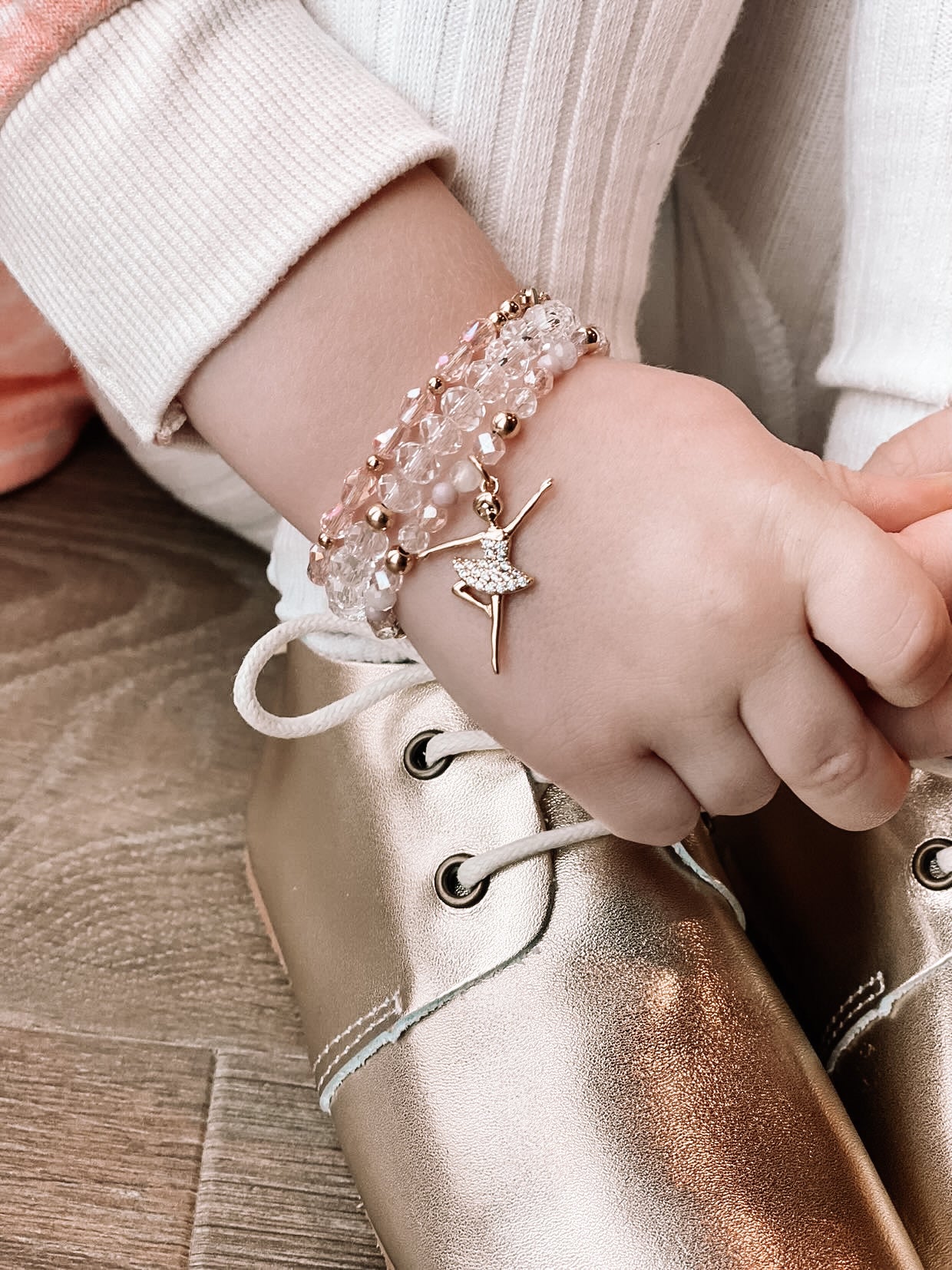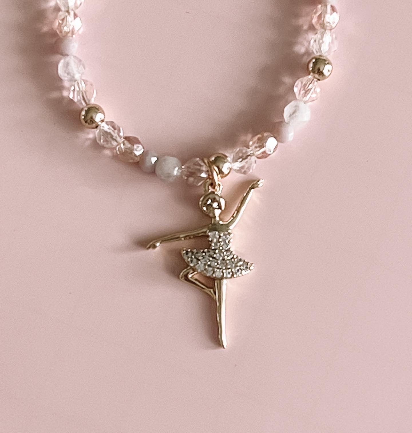this bracelet is made with 3mm clear, pink, and purple beads with a beautiful ballerina charm.