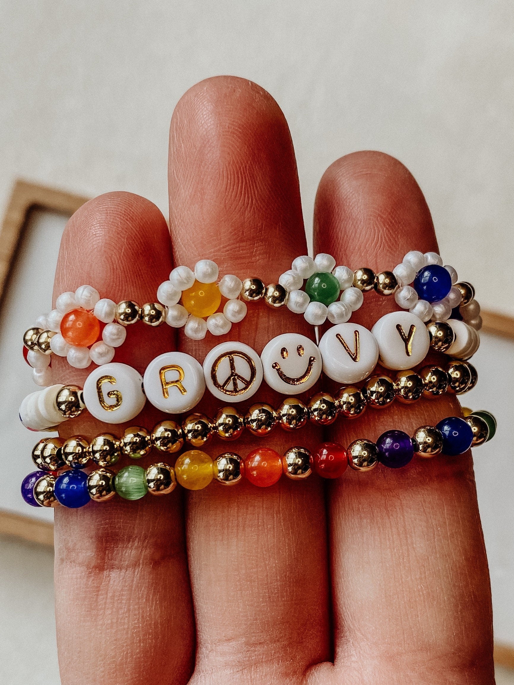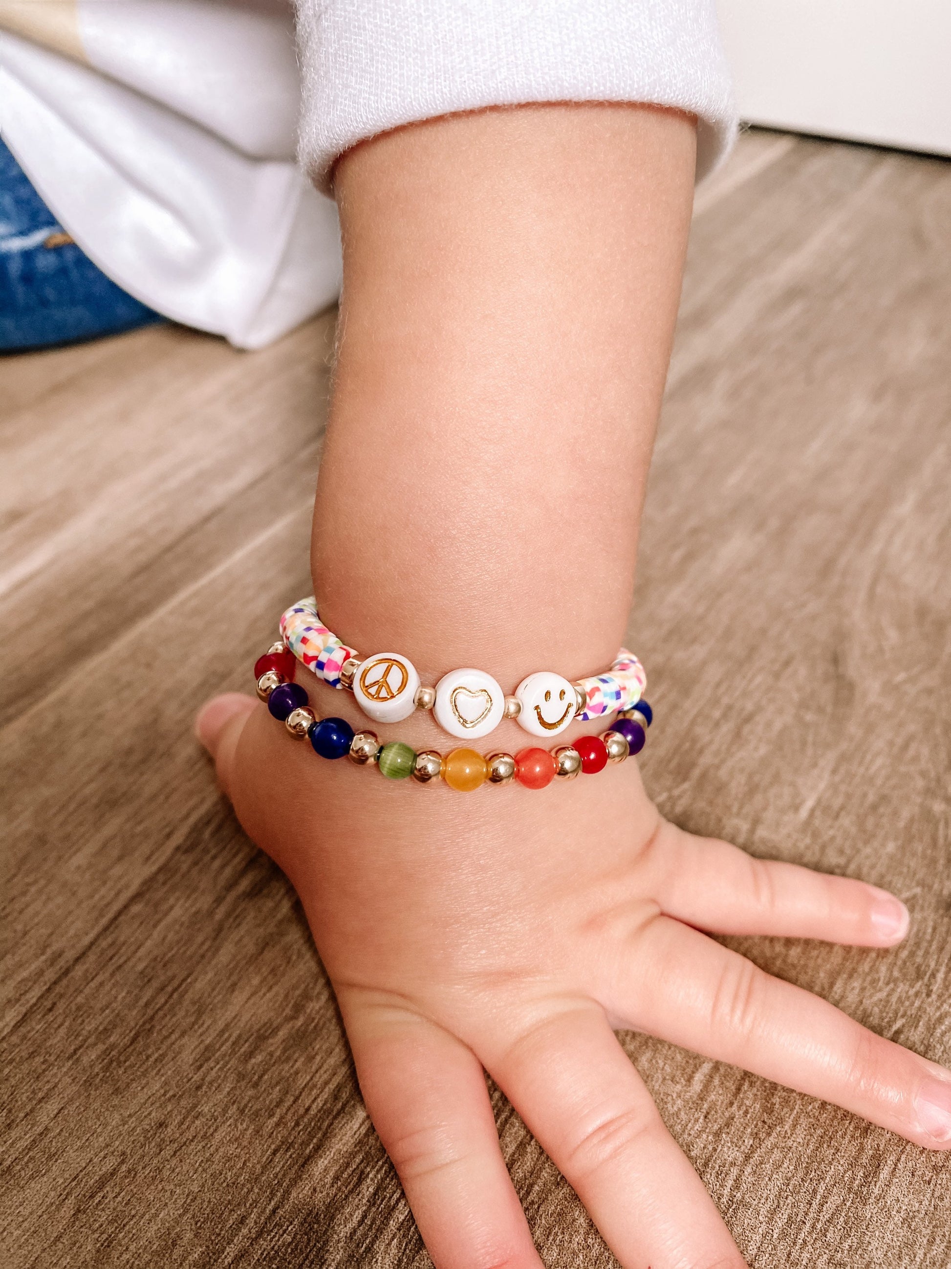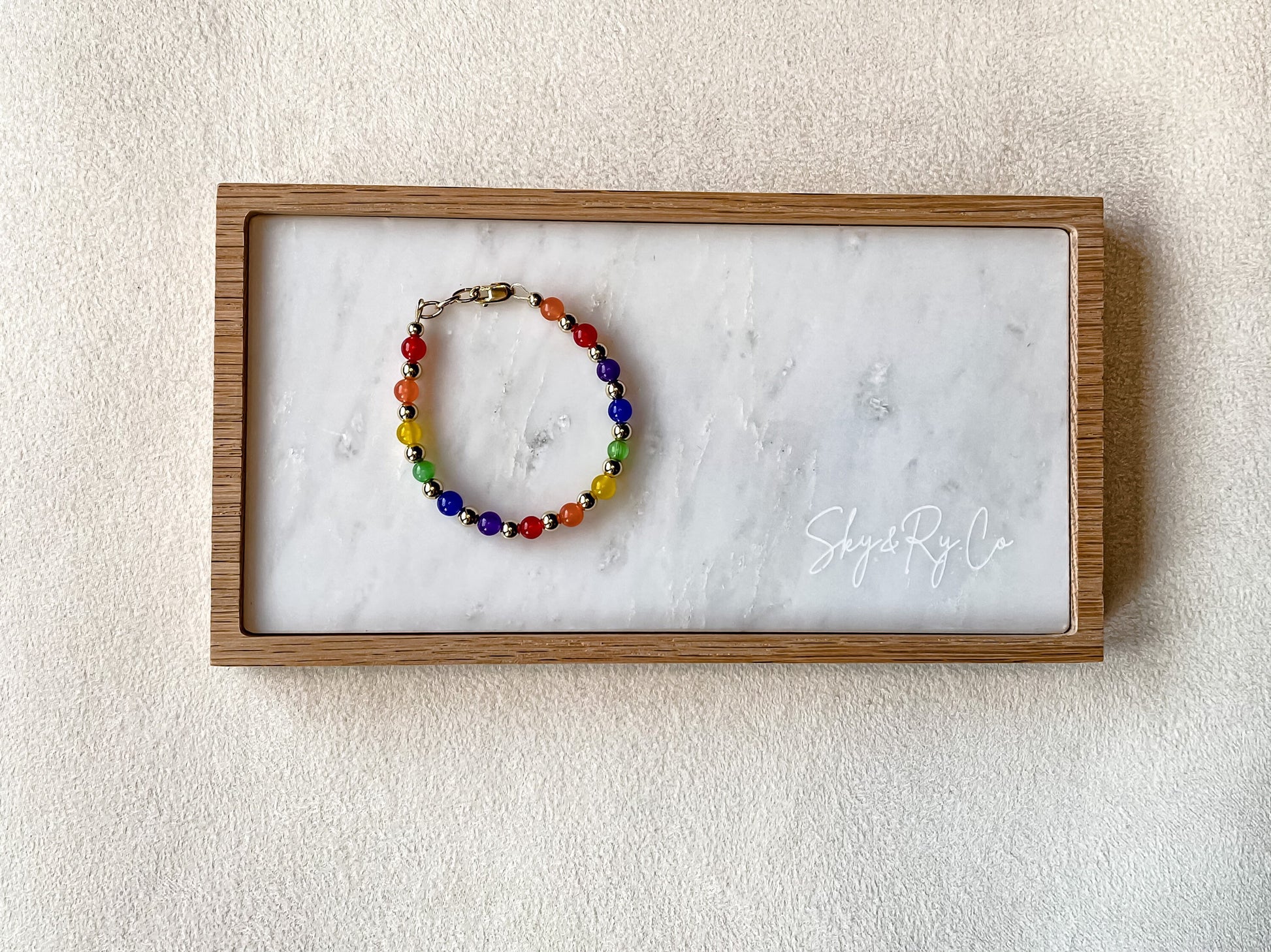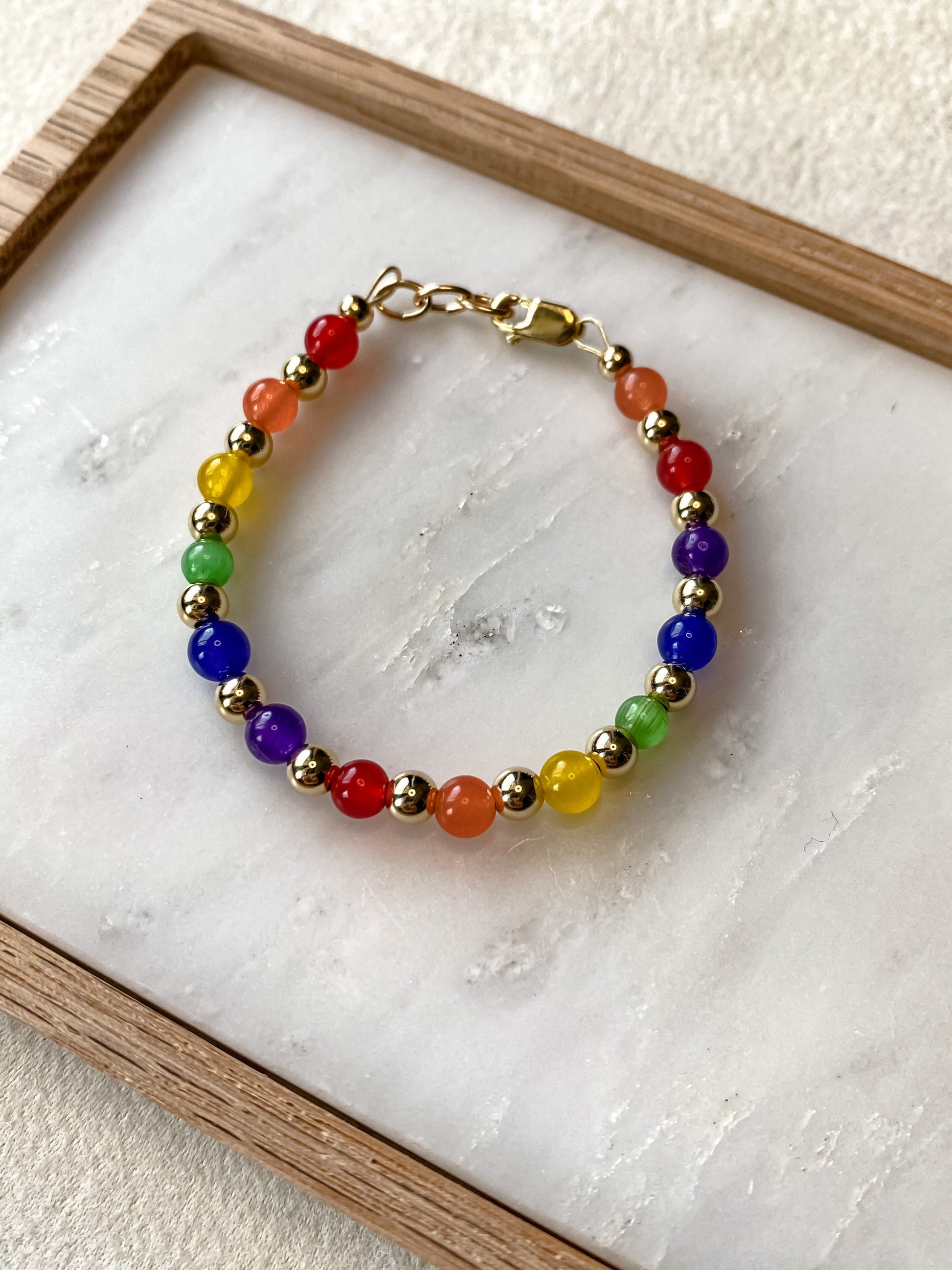 this bracelet is made with 4mm jade beads in primary colors and 4mm gold filled beads