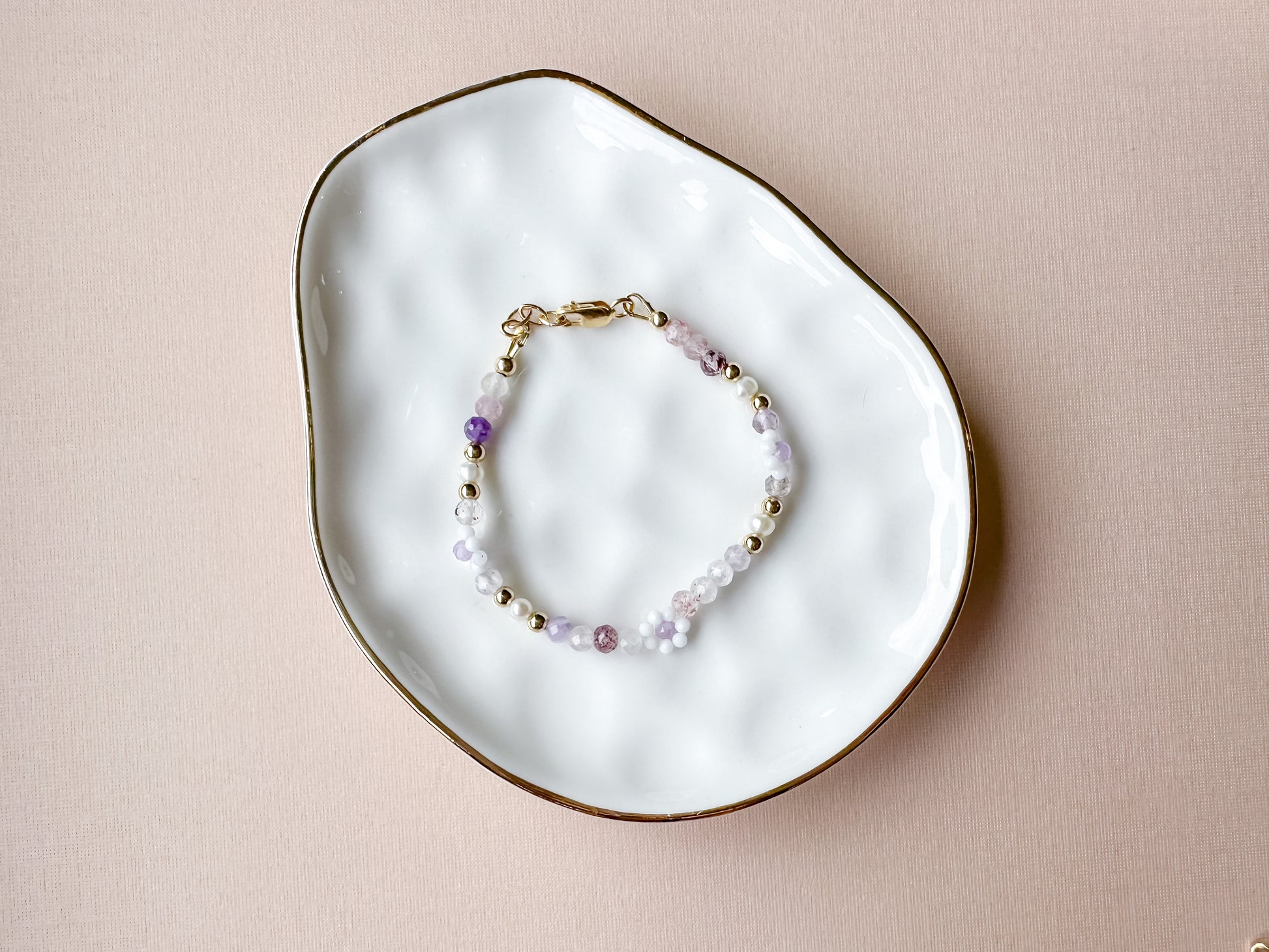 this one-of-a-kind everleigh bracelet is the perfect accessory for the young-at-heart! with its dazzling amethyst, lodalite quartz, fresh water pearls, and gold-filled beads, it's sure to make your inner flower child bloom! the perfect combination of purple and gold awaits you!