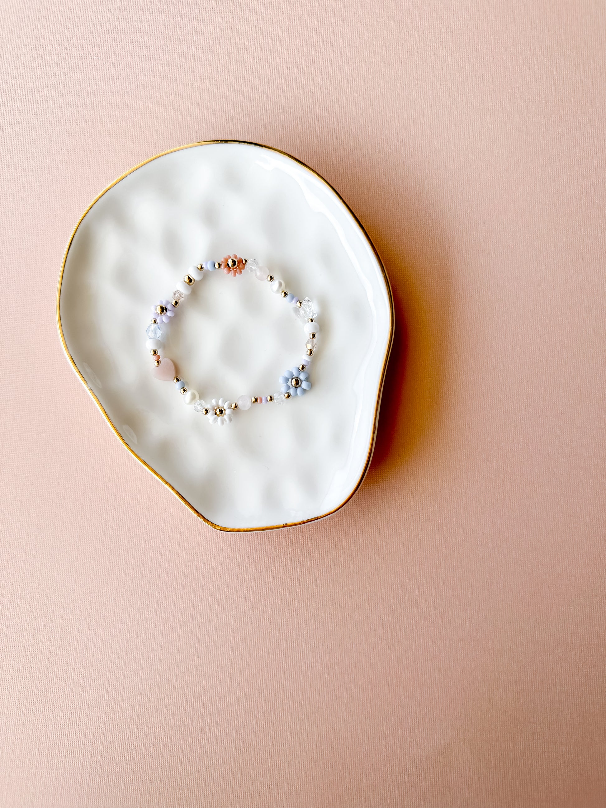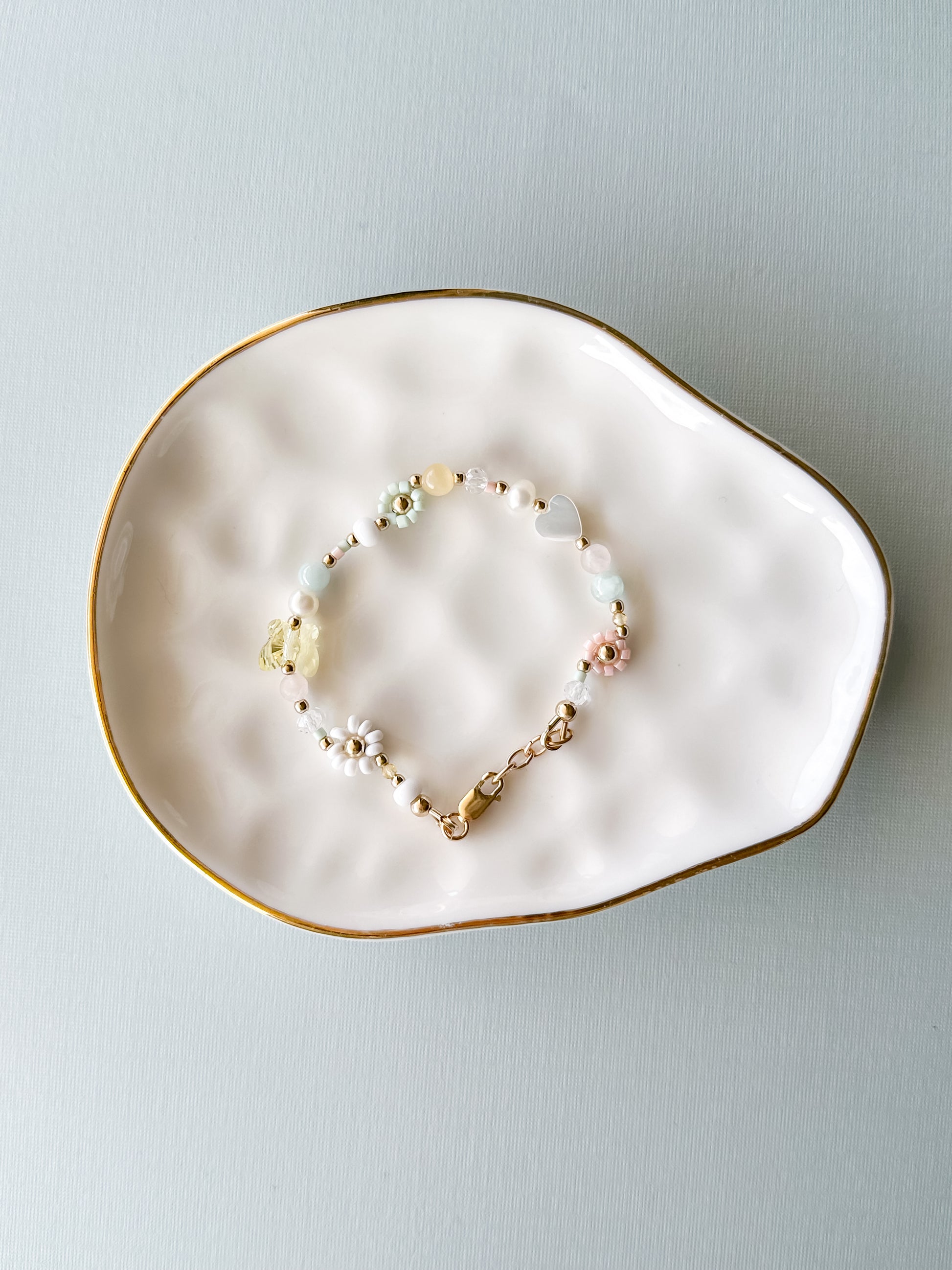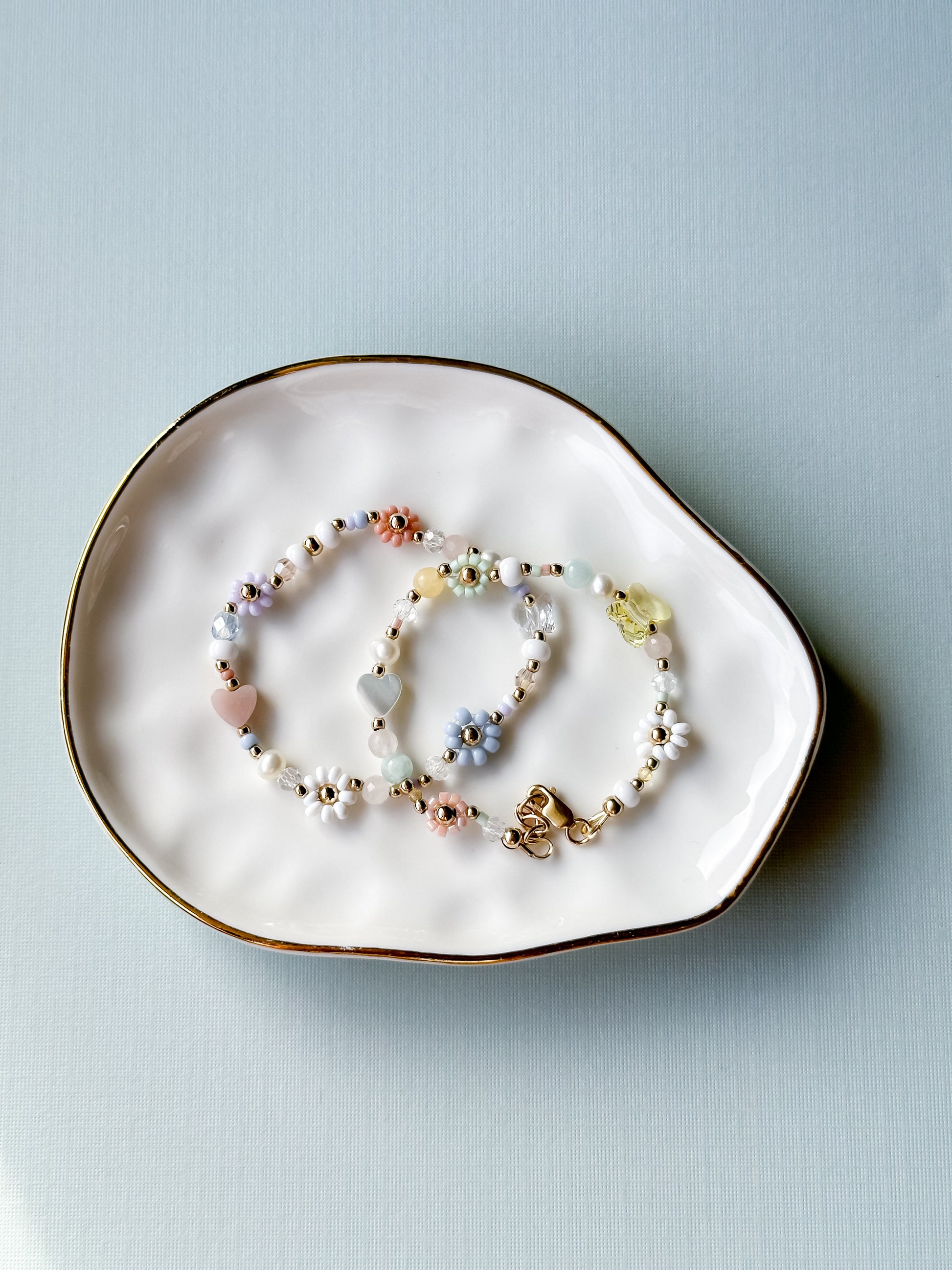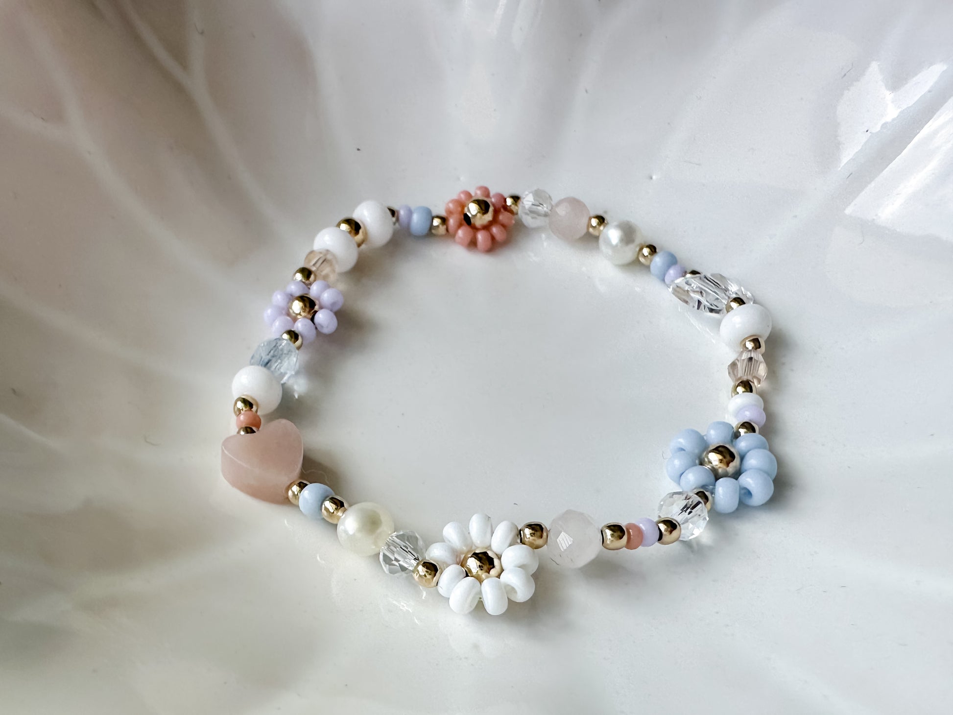 embrace the beauty of spring with our fluttering blossoms babe bracelet! adorned with a delicate swarovski butterfly bead, a charming heart bead, and vibrant flowers in sweet spring colors, this bracelet is the perfect accessory for a playful and fun-loving babe.