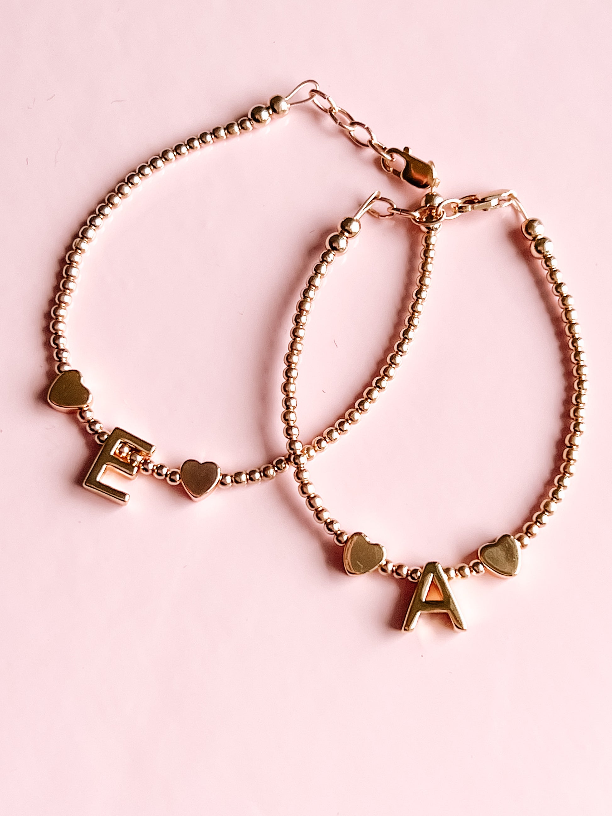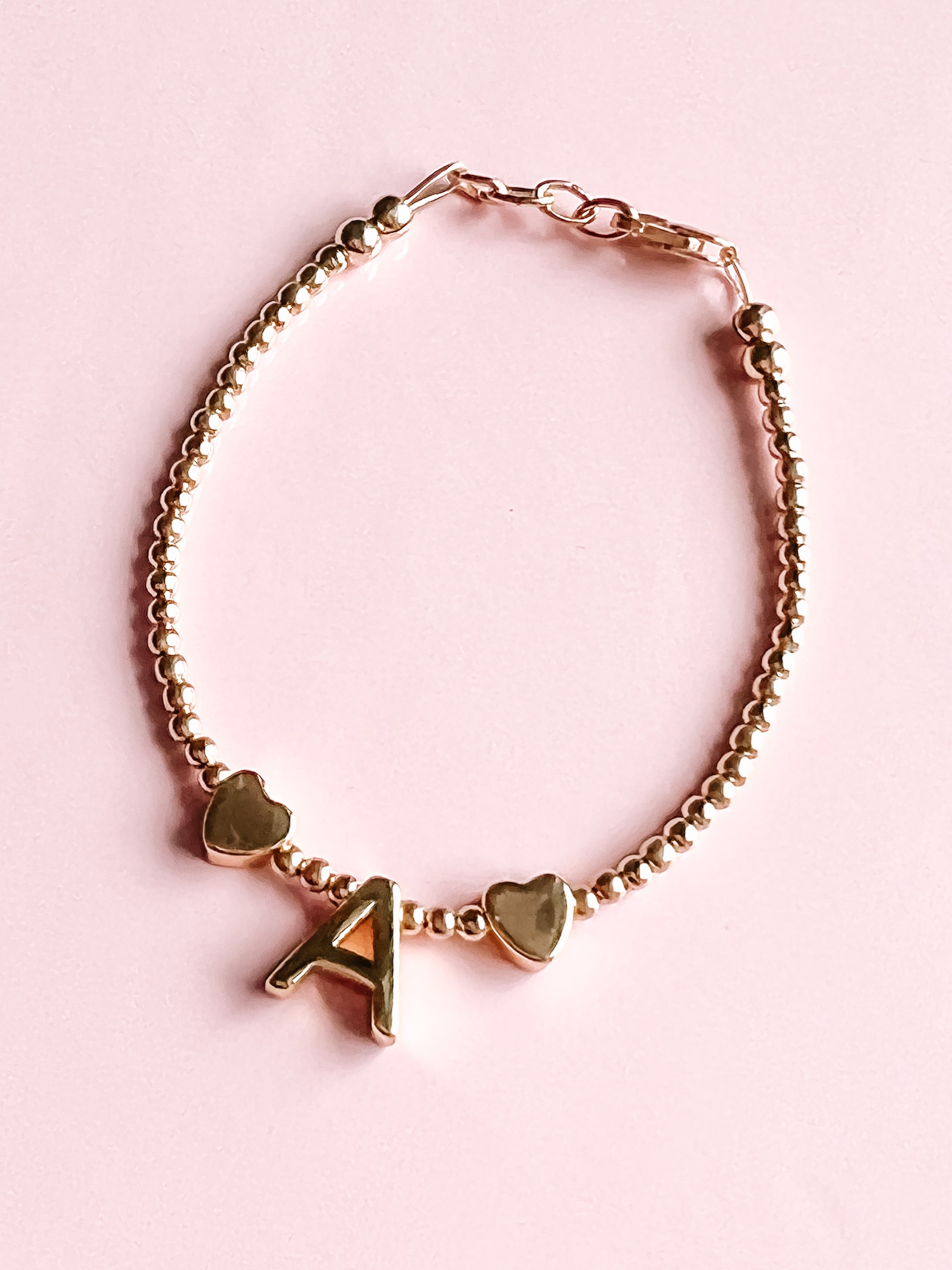 this stunning bracelet is the ultimate addition to your collection - crafted with 2mm gold filled beads and an 18k gold filled initial charm. add gold hearts to elevate your bracelet game, but no pressure!