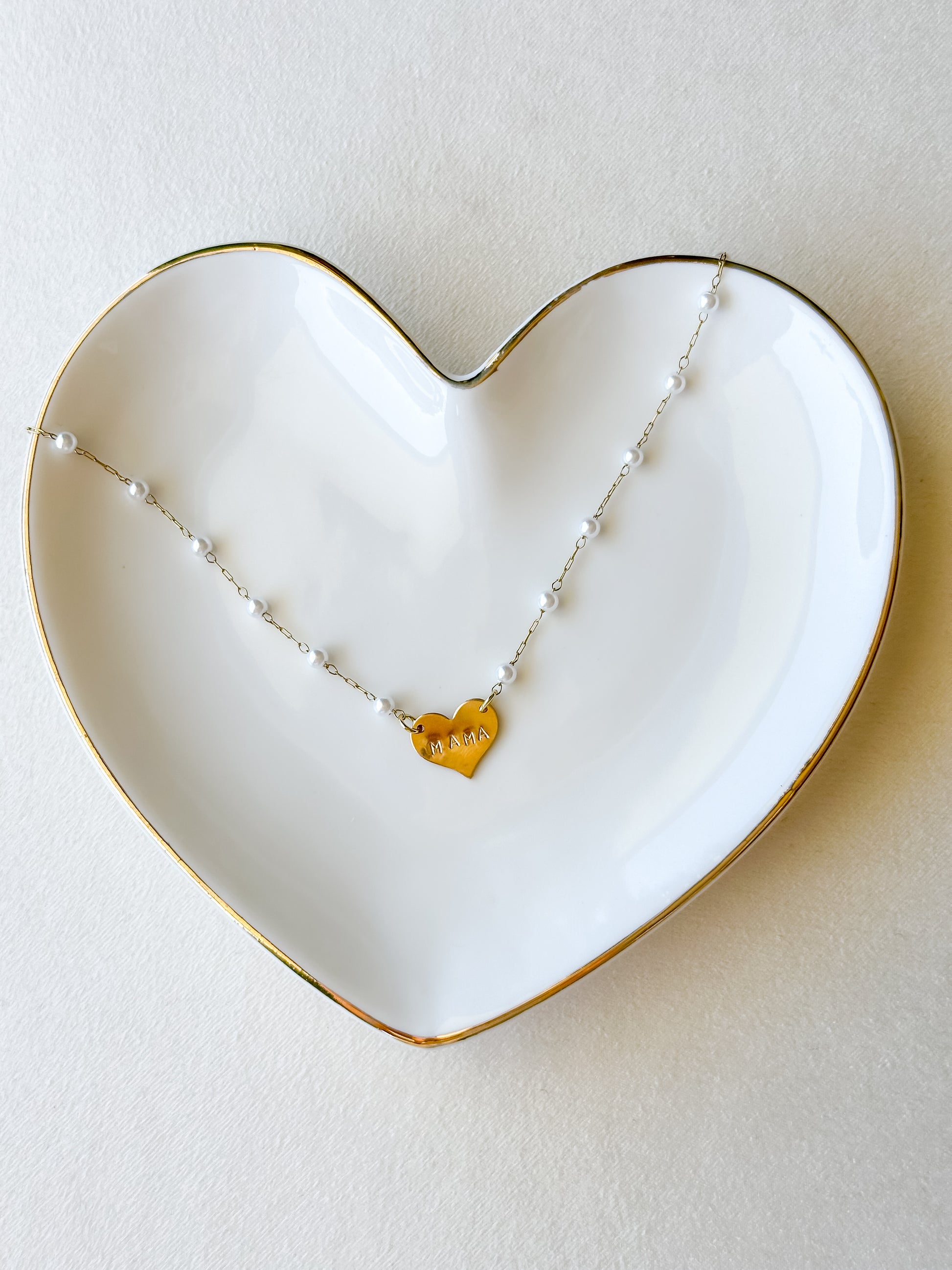 the hand stamped charm is a testament to motherhood while the pearl necklace chain adds a touch of elegance. show off your mama pride in a charming and playful way!