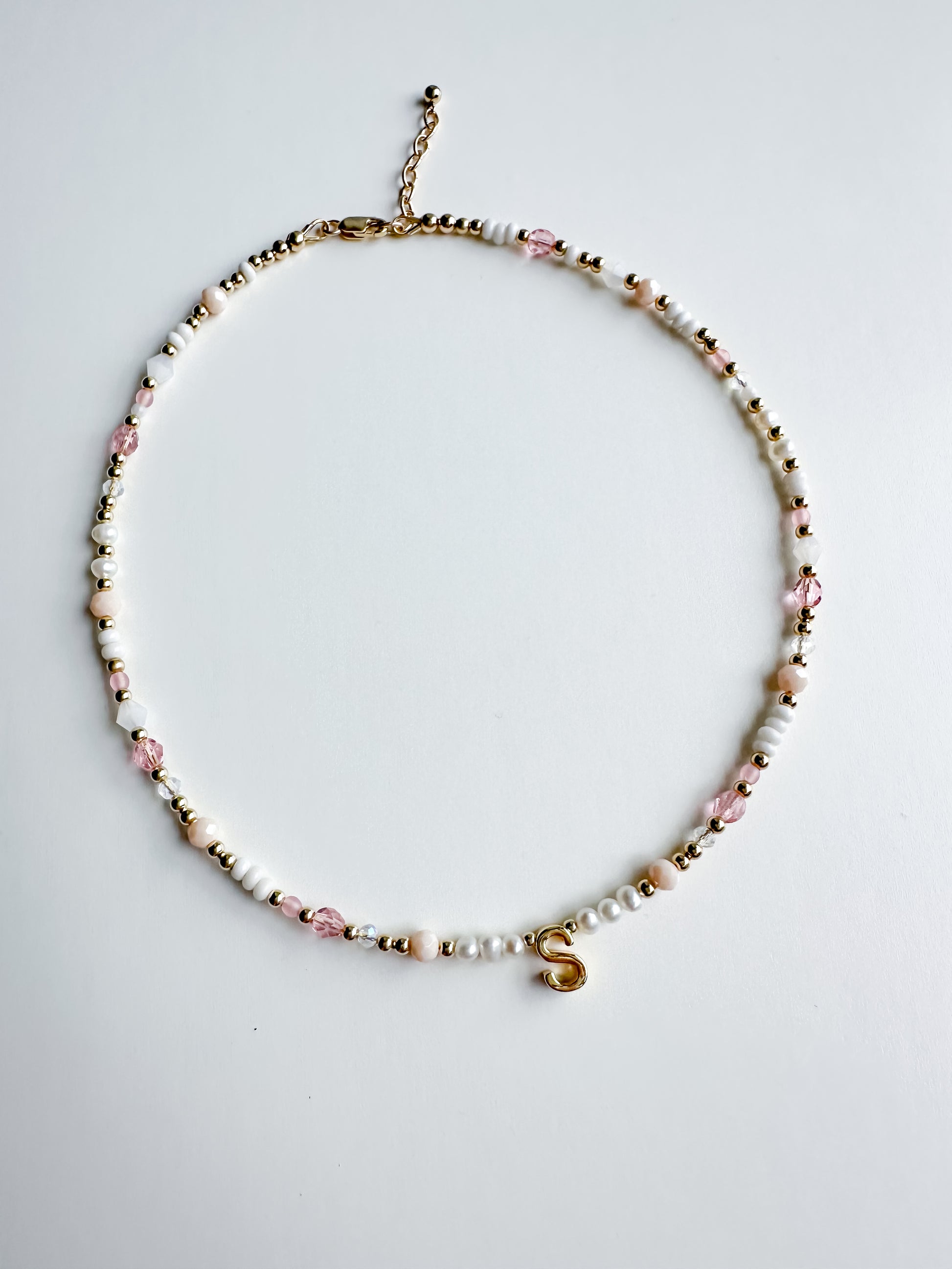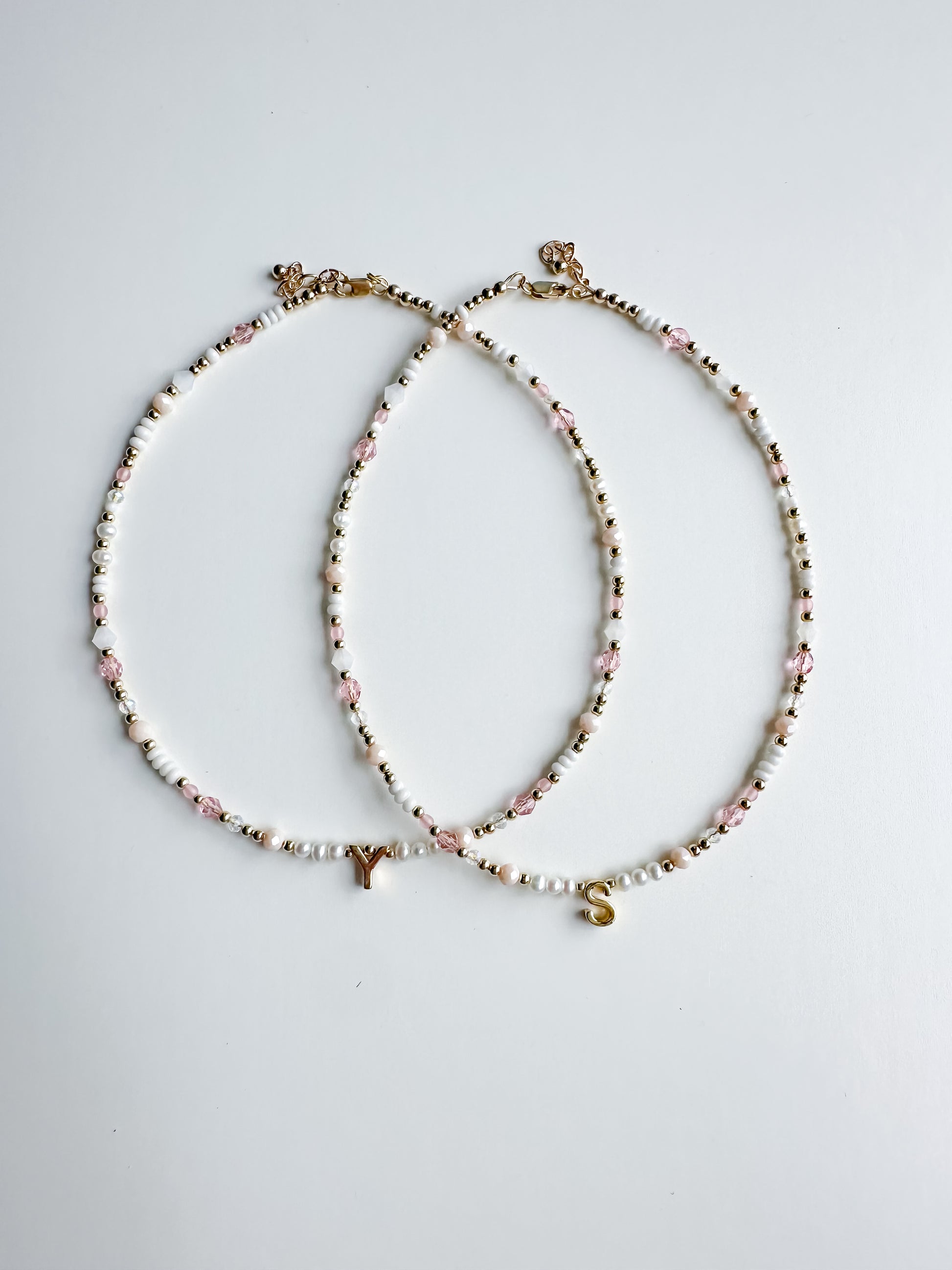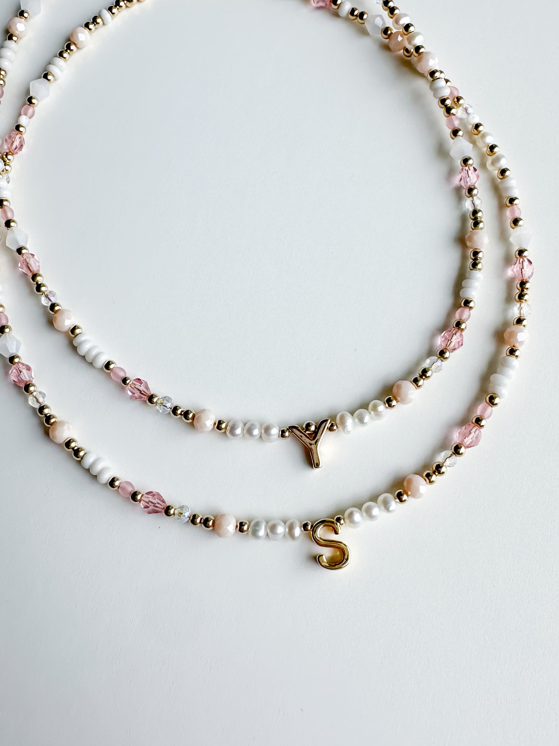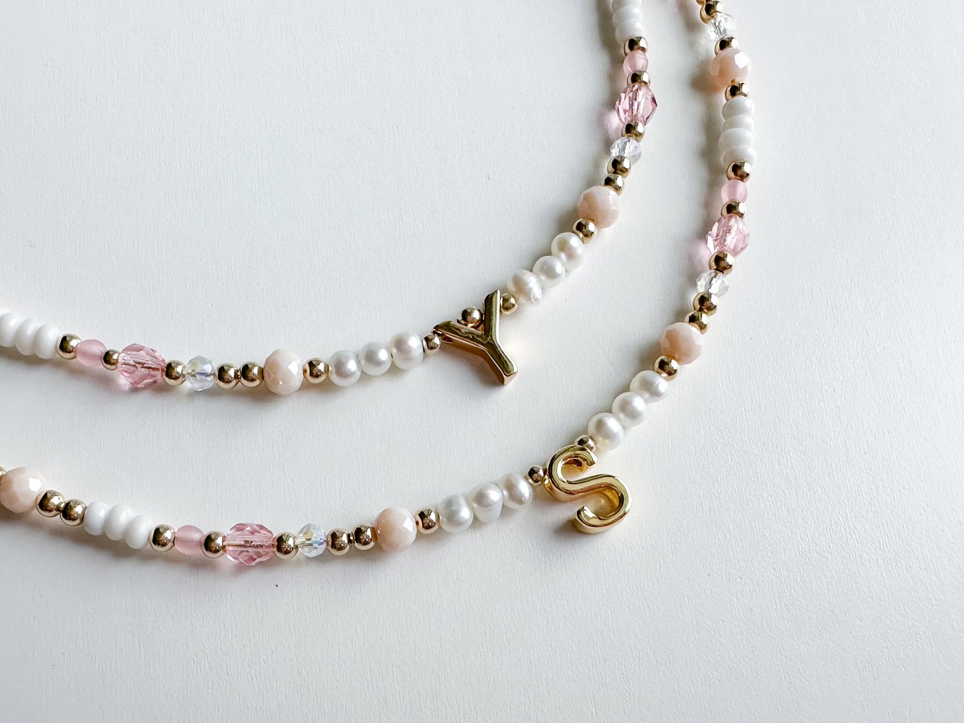 add a touch of personalization with our initial beaded necklace. the neutral color palette with a hint of pink makes it versatile for any outfit. the 2.5mm goldfilled beads and initial add a touch of elegance. perfect for gifting!