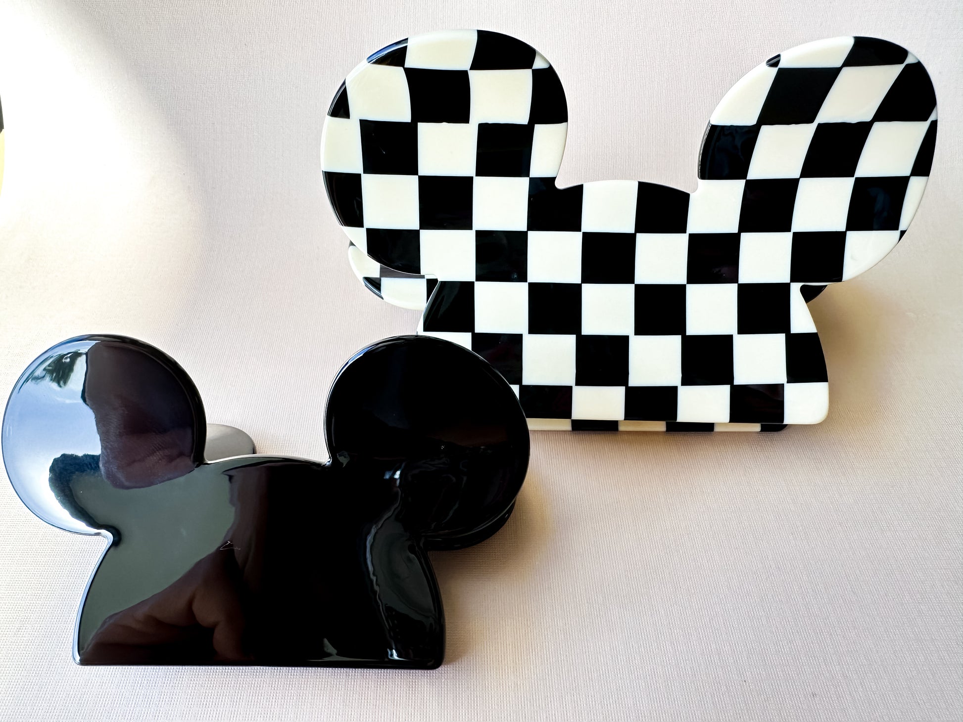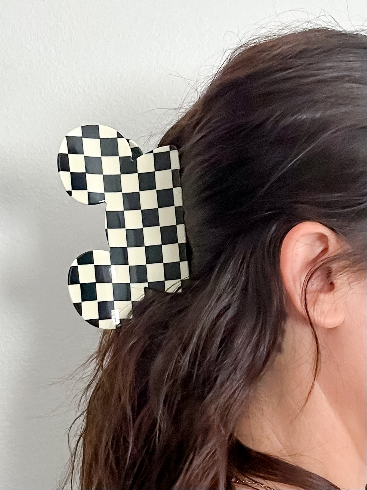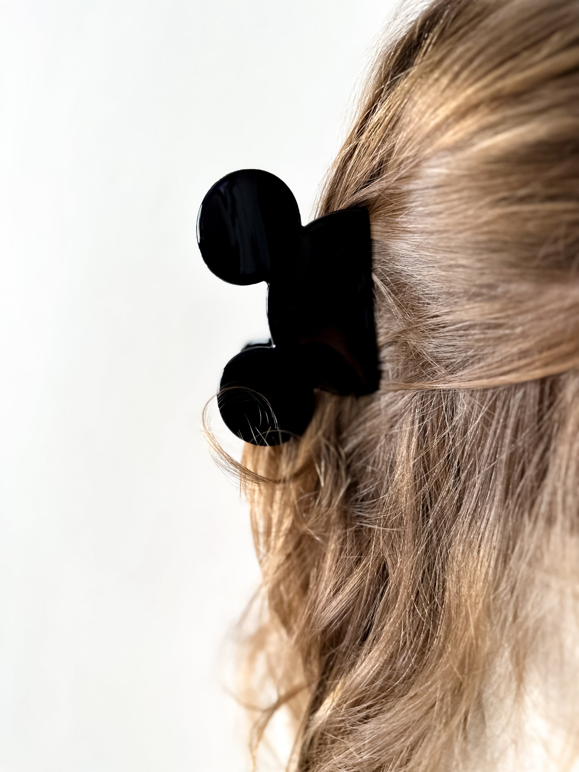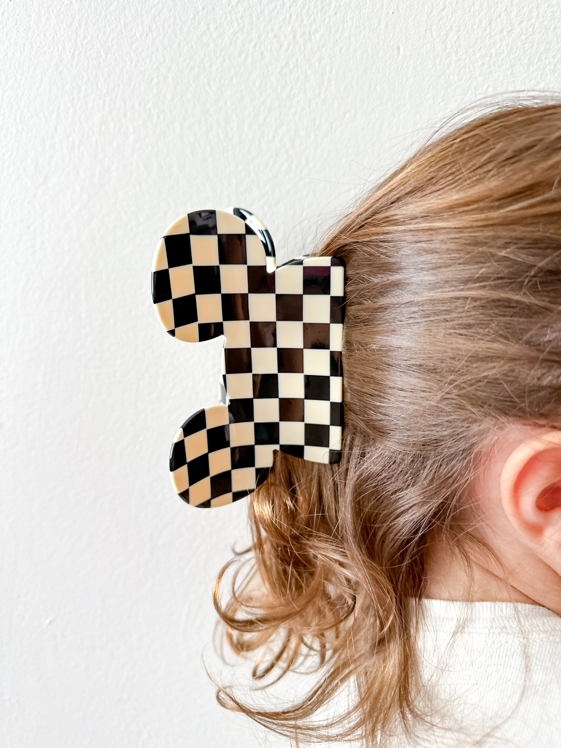 (small black claw clip pictured in first photo, large checkered claw clip featured in the other two photos on a toddler and adult)