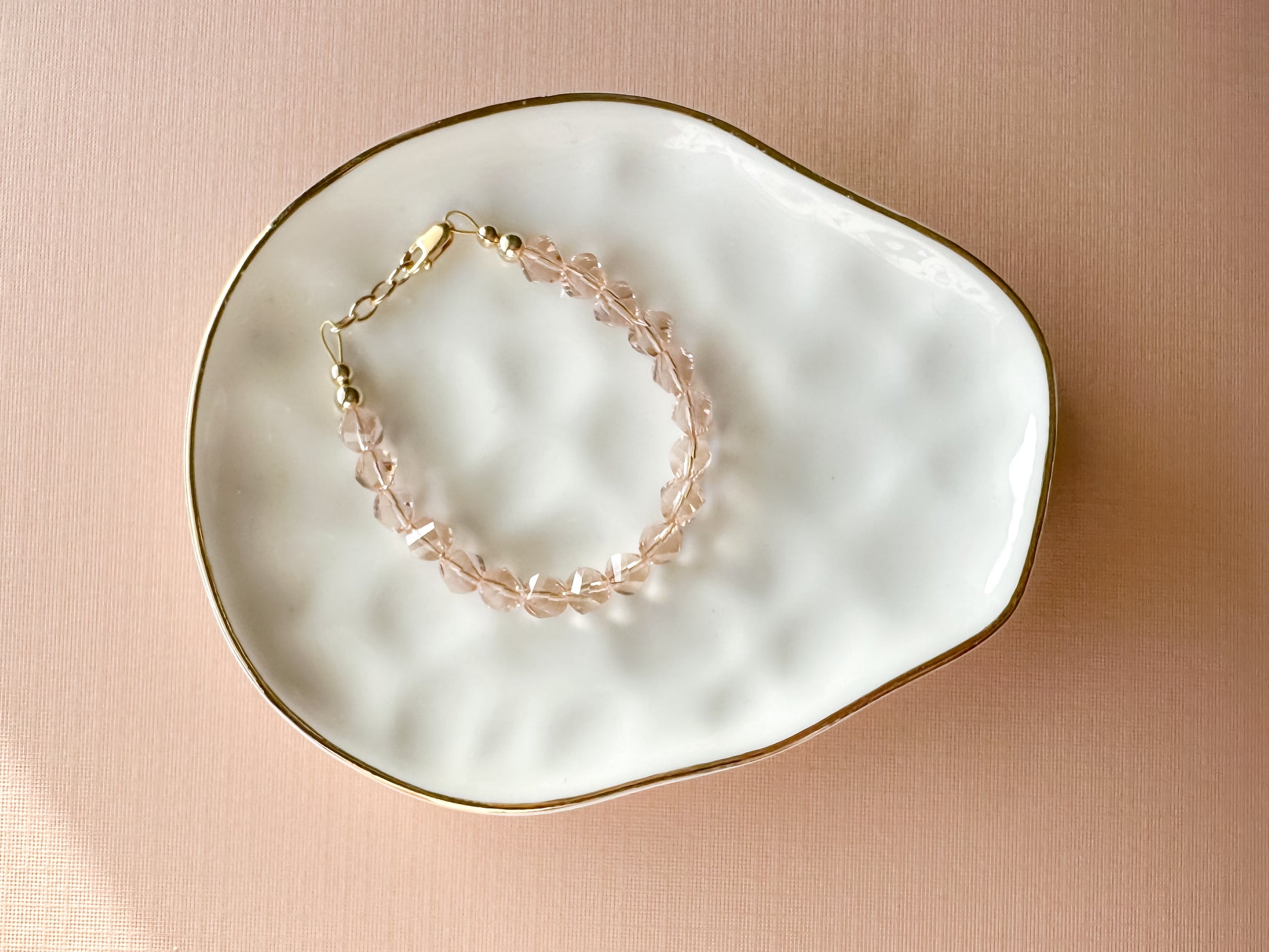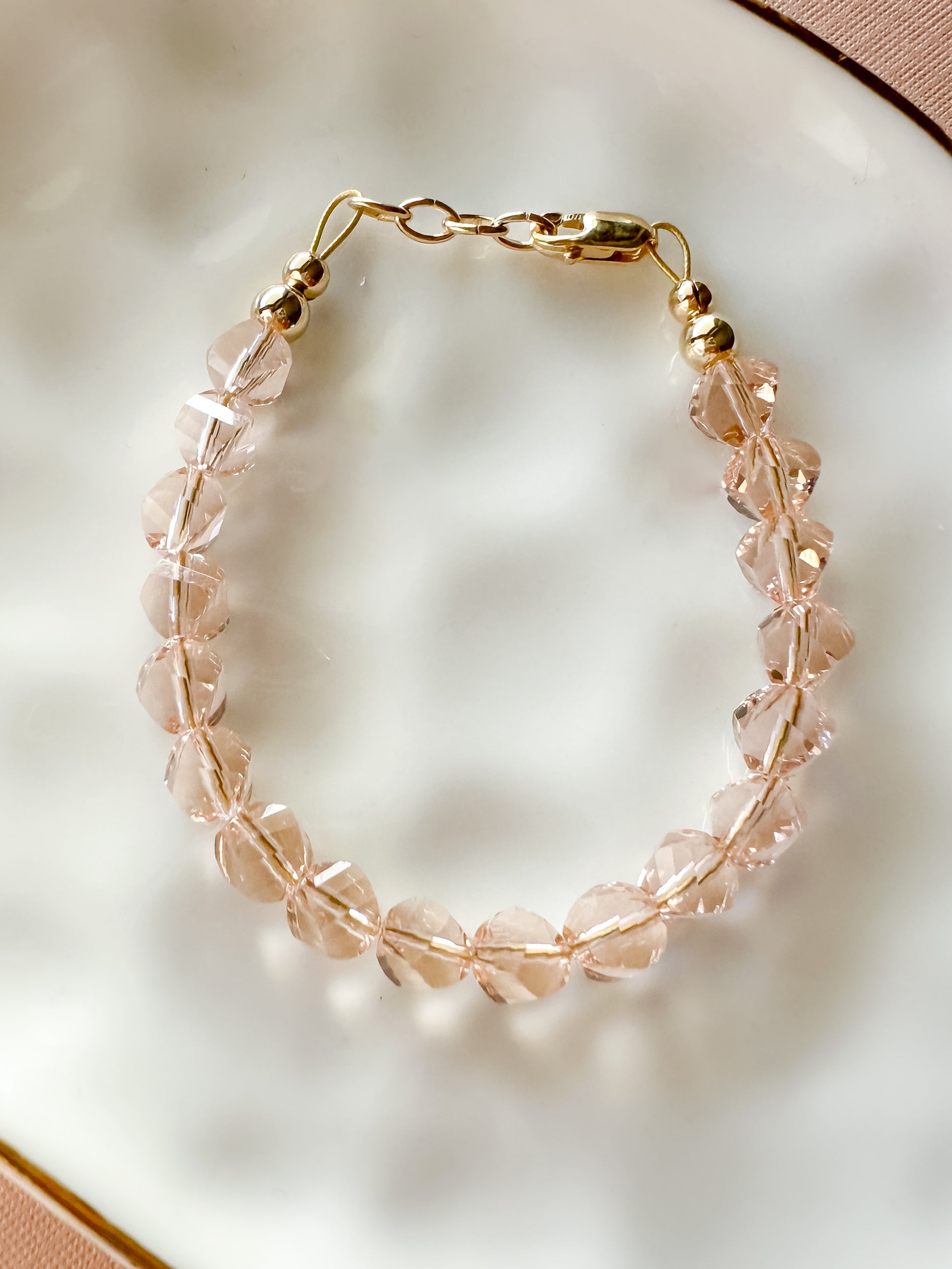 add some sparkle to your wrist with our peach bellini bracelet. featuring twisted crystal peach beads that catch the light and shine, this playful accessory is sure to make a statement. perfect for the babe who loves a touch of whimsy (and a lot of shimmer) in her style!