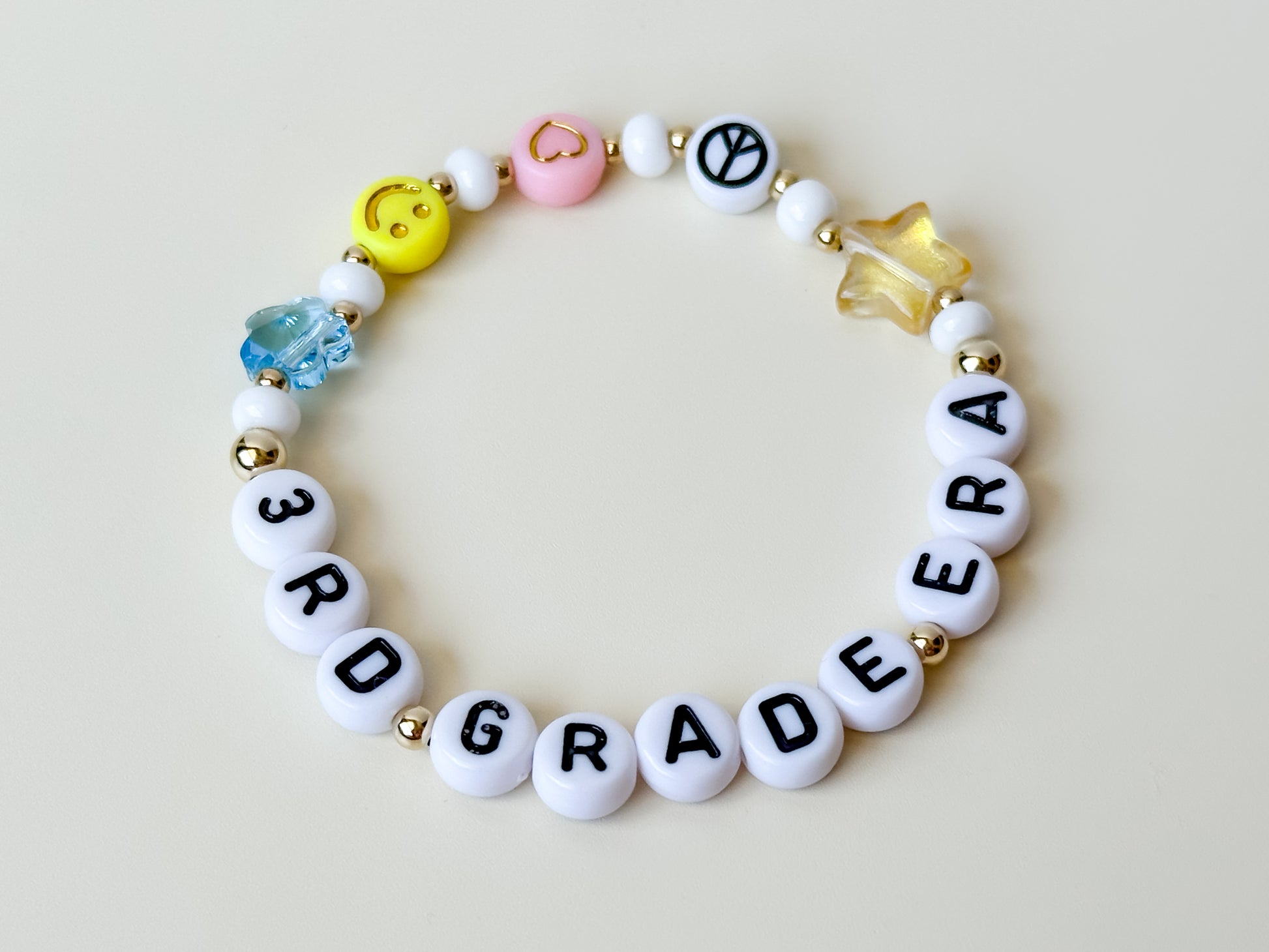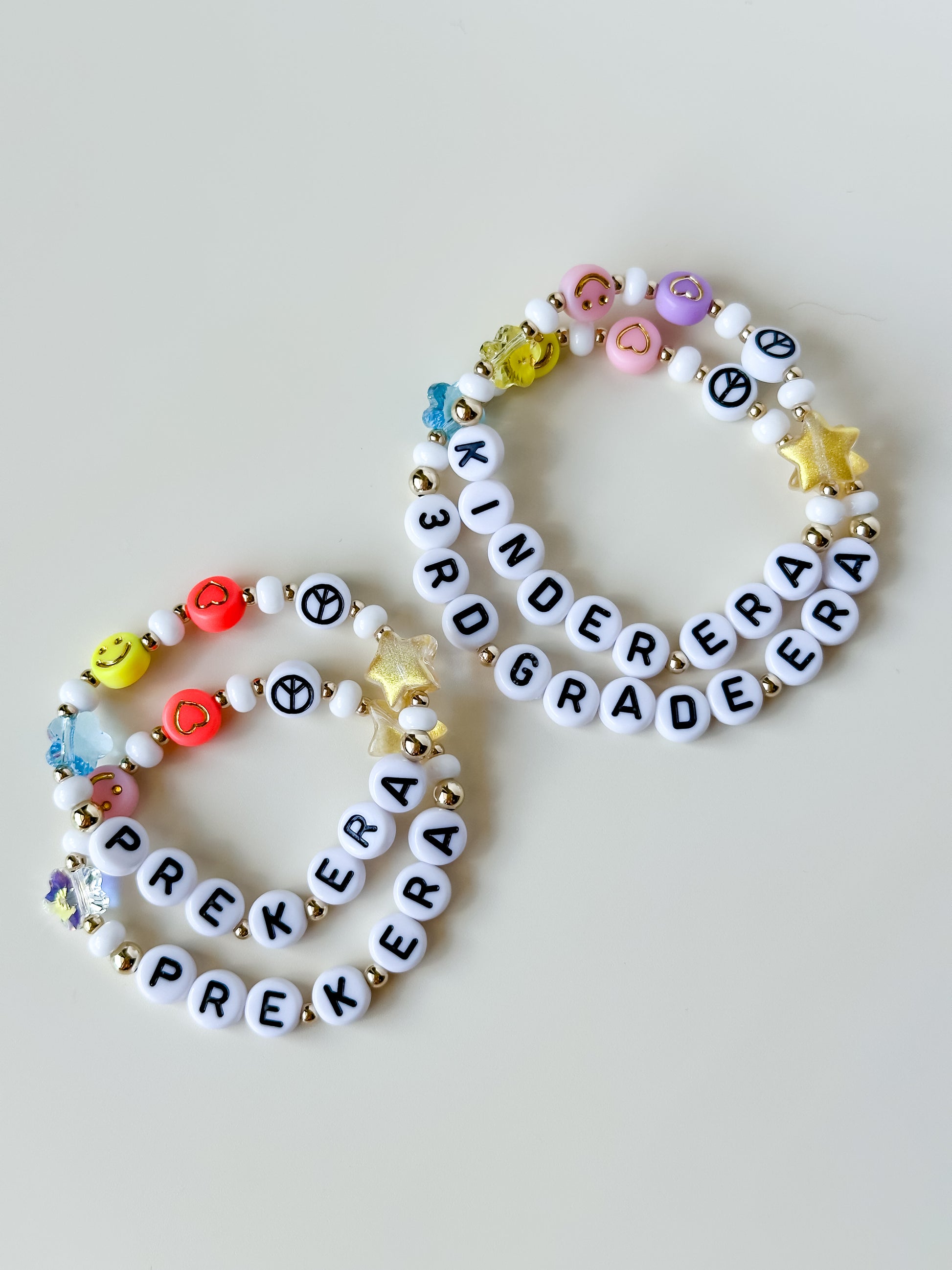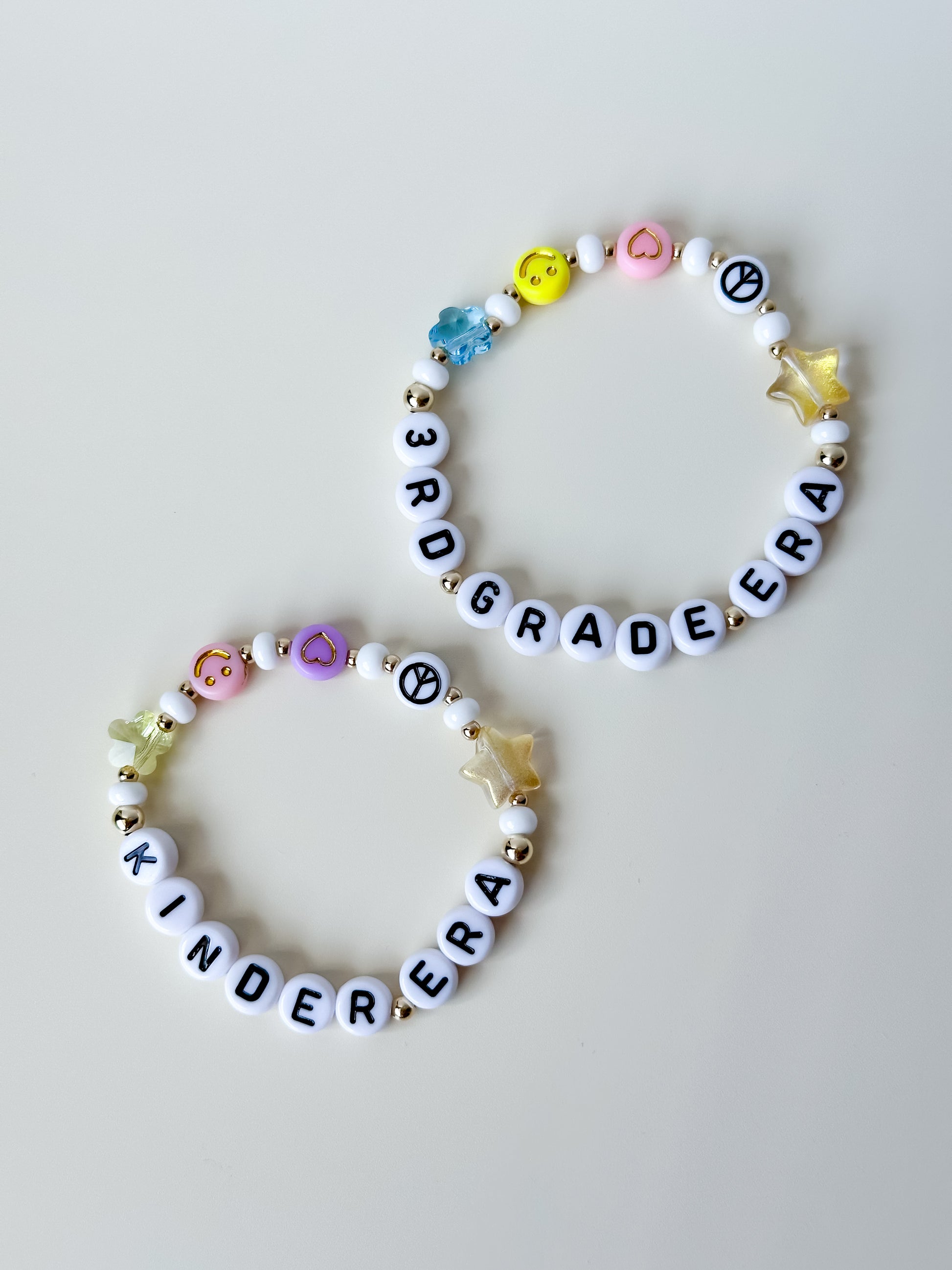 get ready for back-to-school with the school era bracelet! this fun accessory allows you to show off your kid's year!