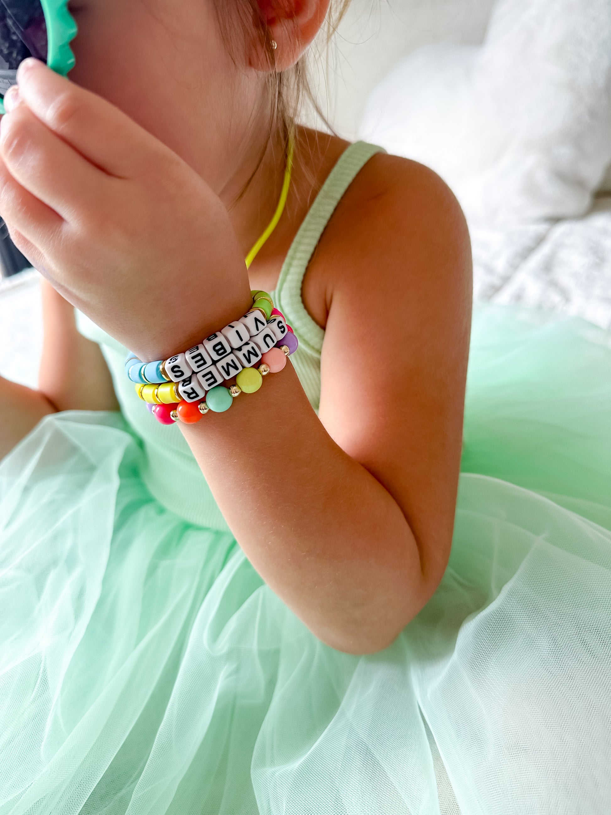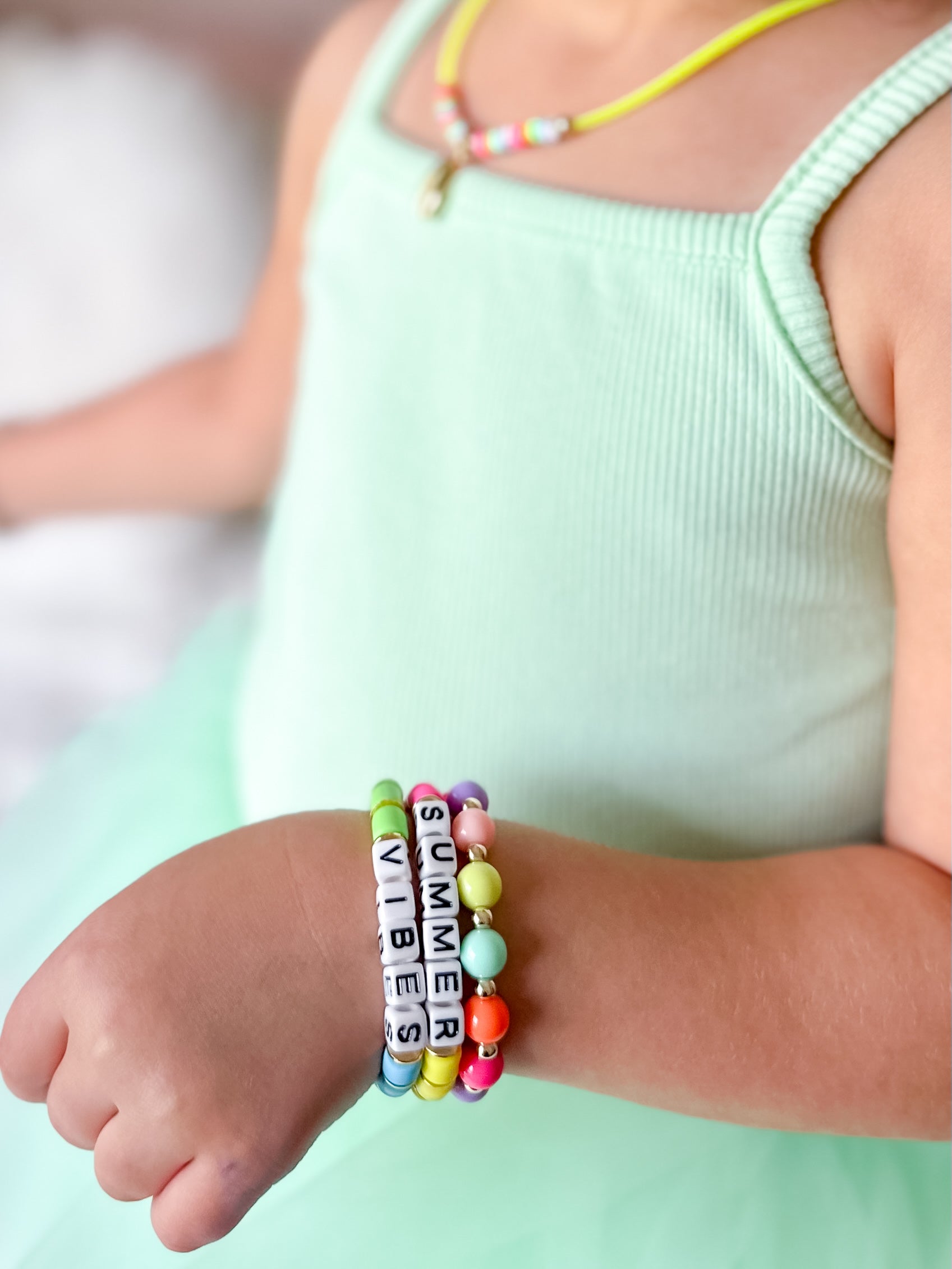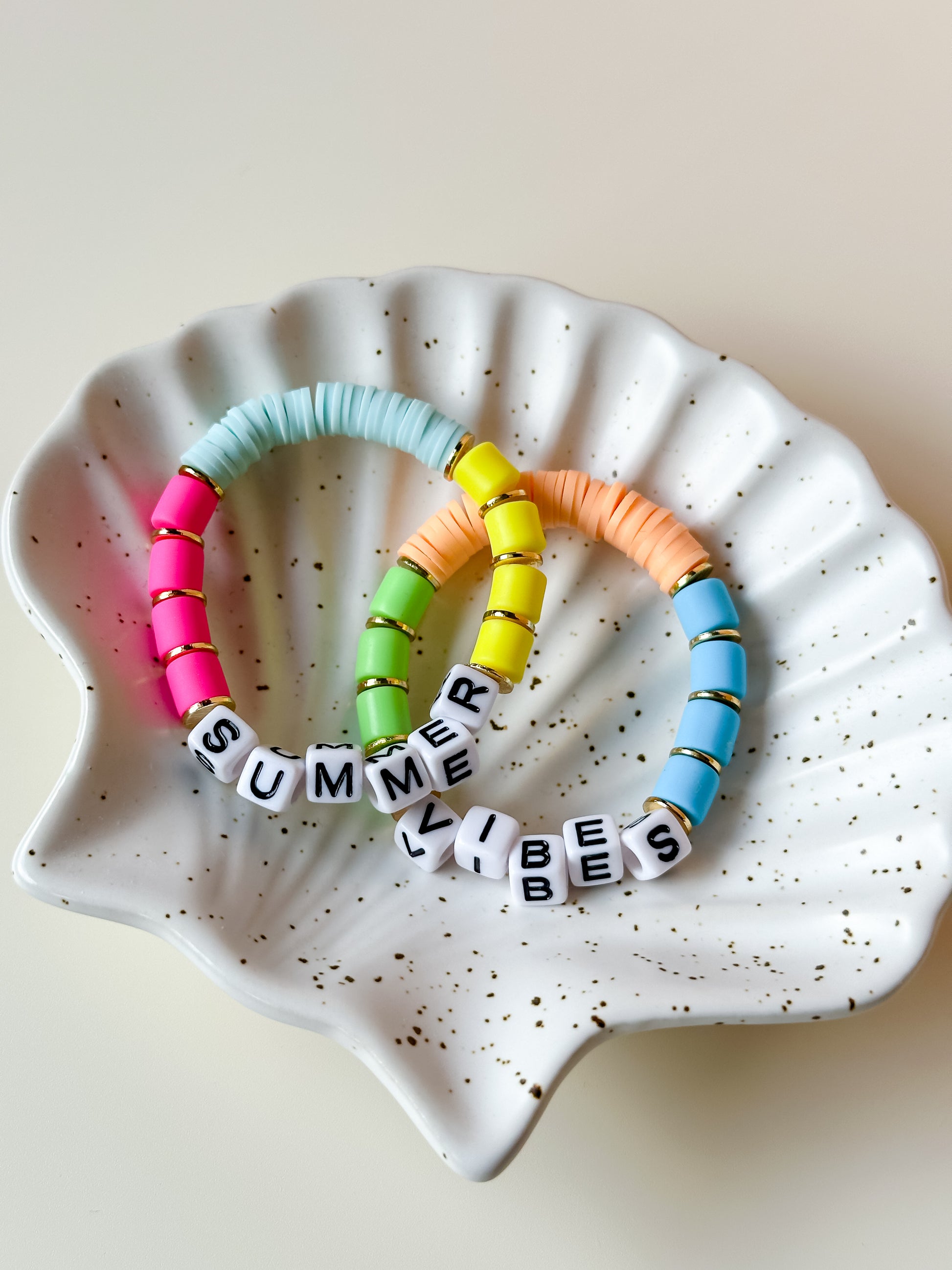 get your summer vibes on with this customizable chunky name bracelet! choose your three vibrant heishi colors and add your own personal touch with a name or saying. express yourself with this playful and unique accessory.