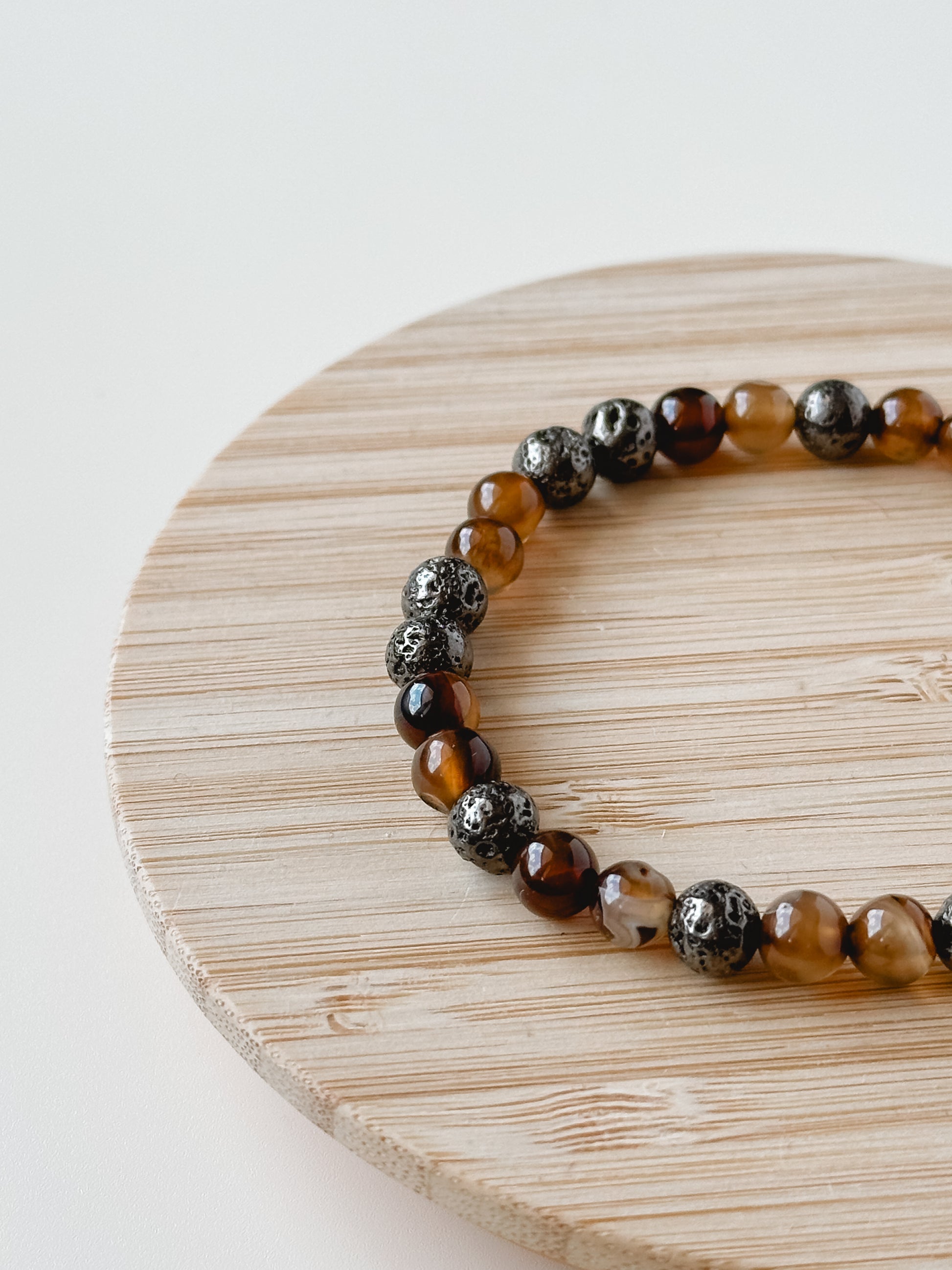 elevate your style with our volcanic earth bracelet. adorned with gunmetal plated lavas rock beads and brown agate stripe beads, this bracelet exudes sophistication and exclusivity. embrace the power and beauty of nature, wrapped around your wrist.